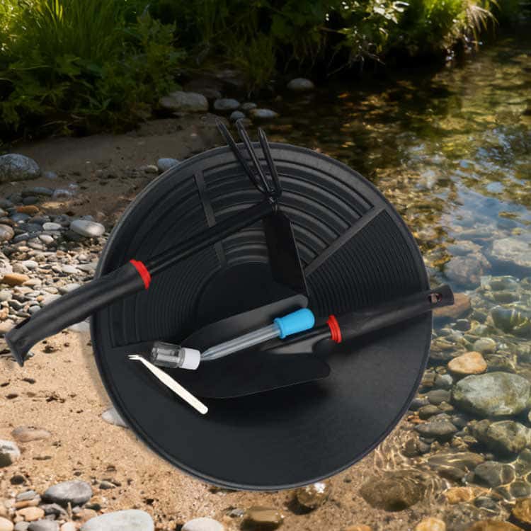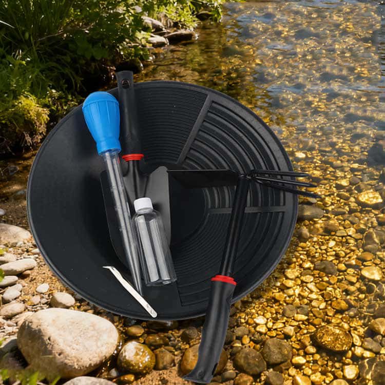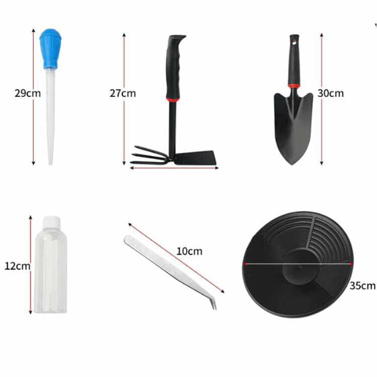 セットにはパンニング皿、小瓶、フック、シャベル、試験管が含まれ、手動洗浄が可能です。
