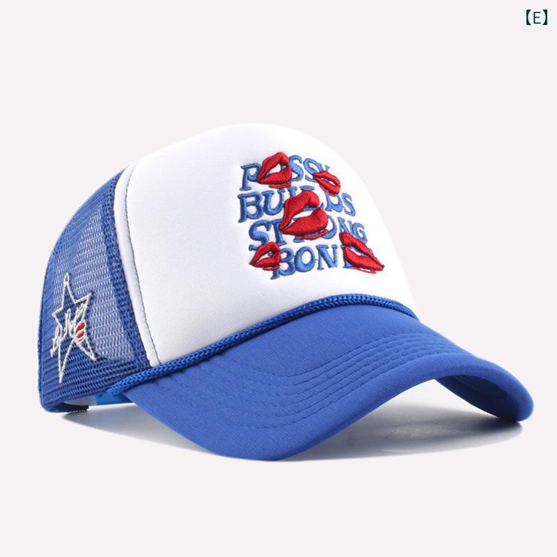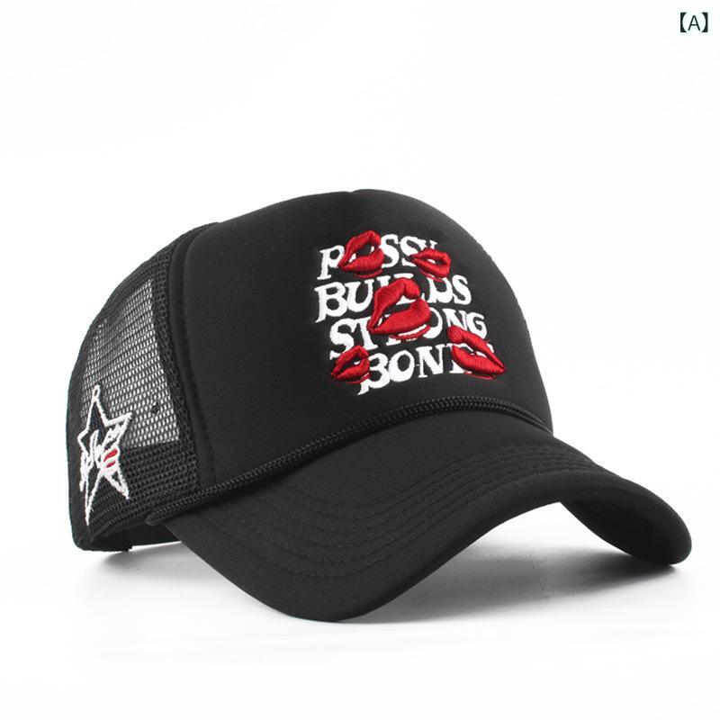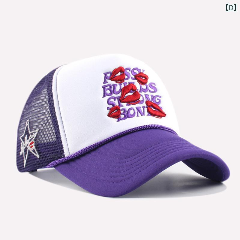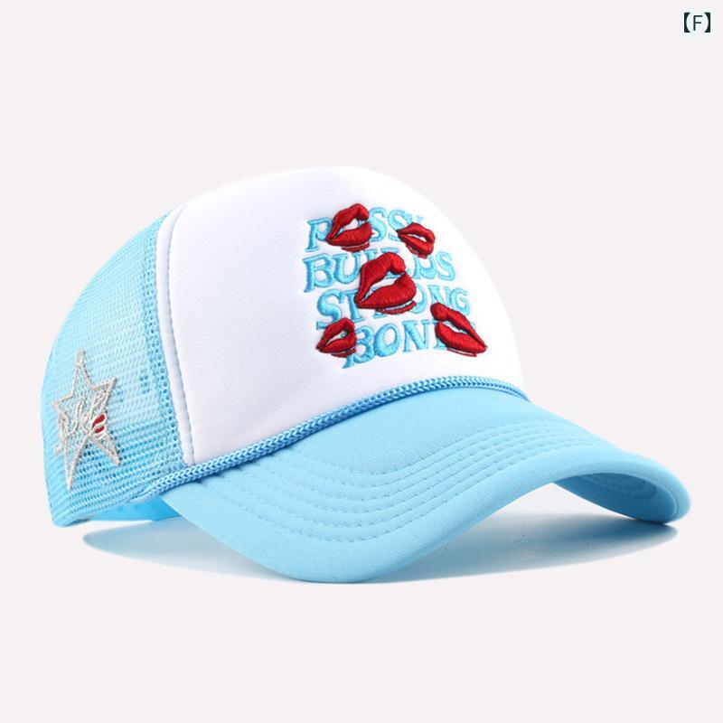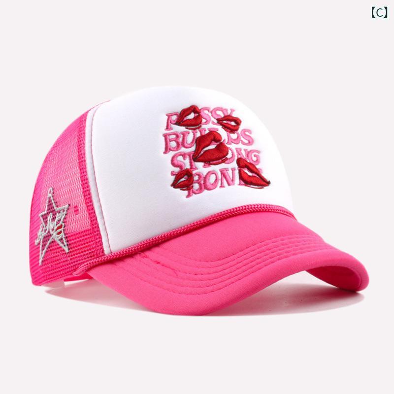 キャップ 男女兼用 リップ ロゴ刺繍 メッシュ 通気性 カーブバイザー 日よけ ストリート ヒップホップ カジュアル 綿ポリエステル アジャスター付き 黒 ファッション 春夏 ピンク 青