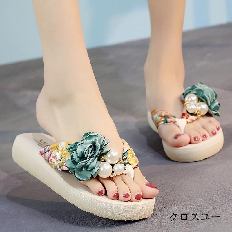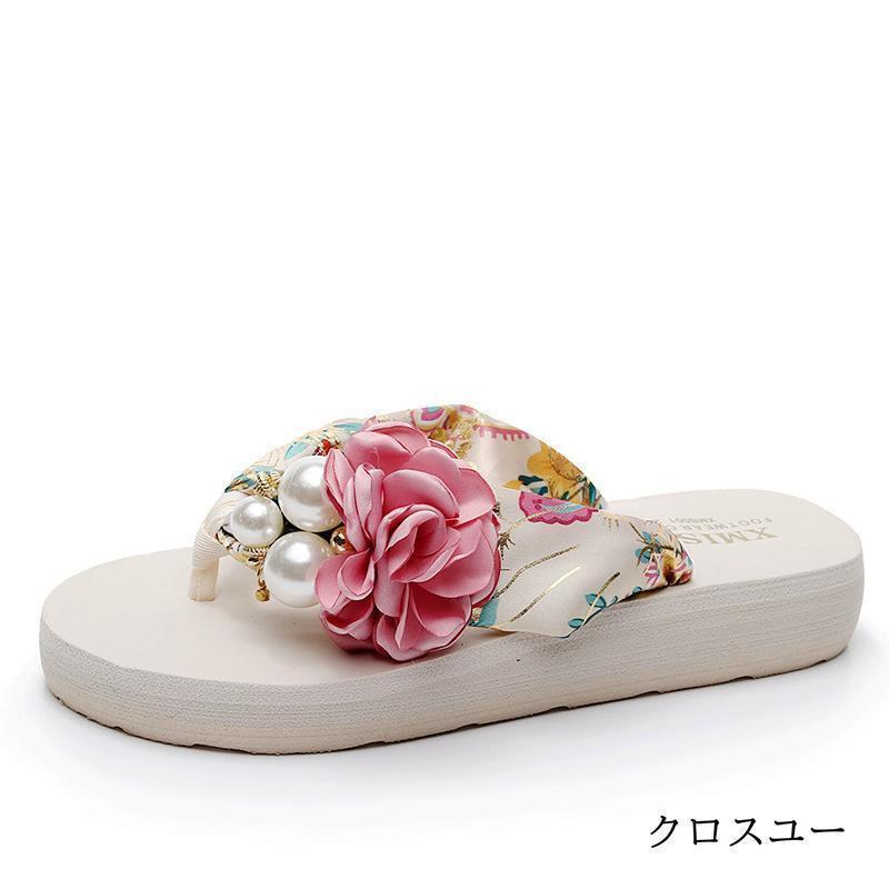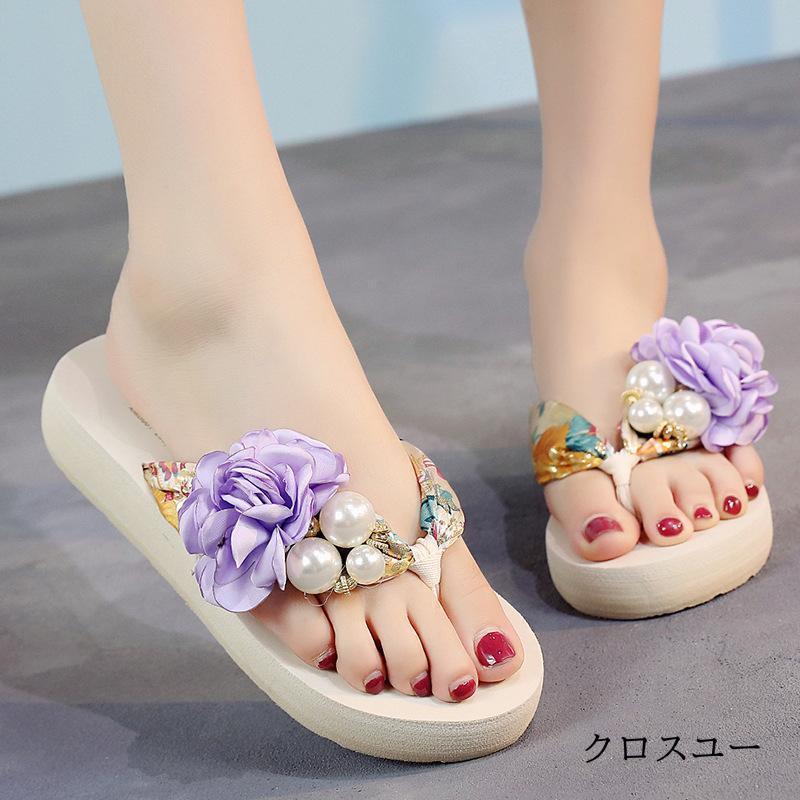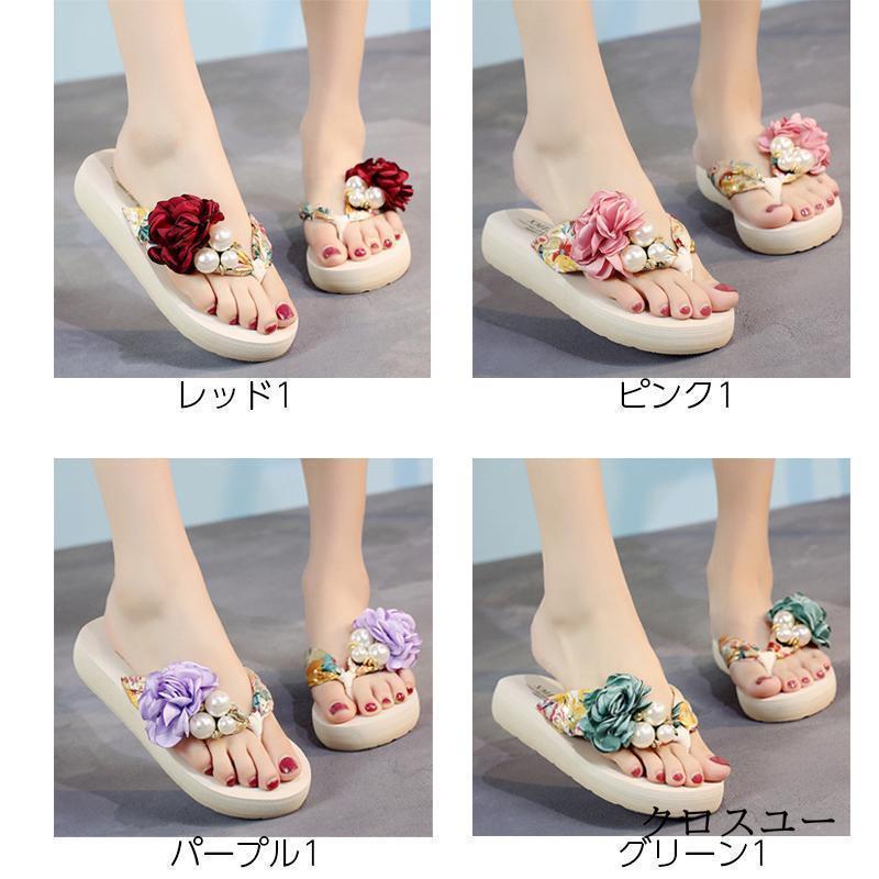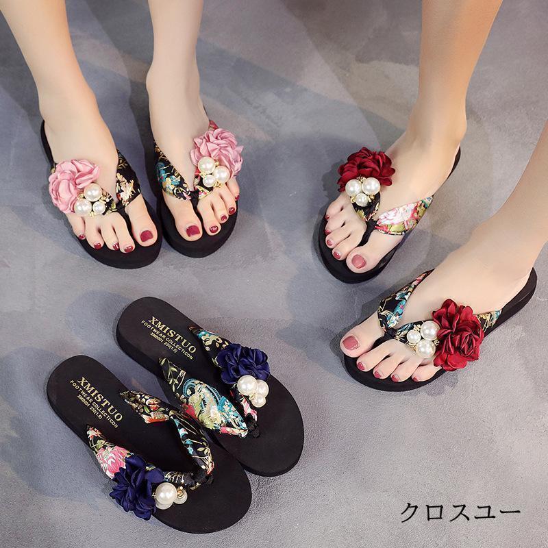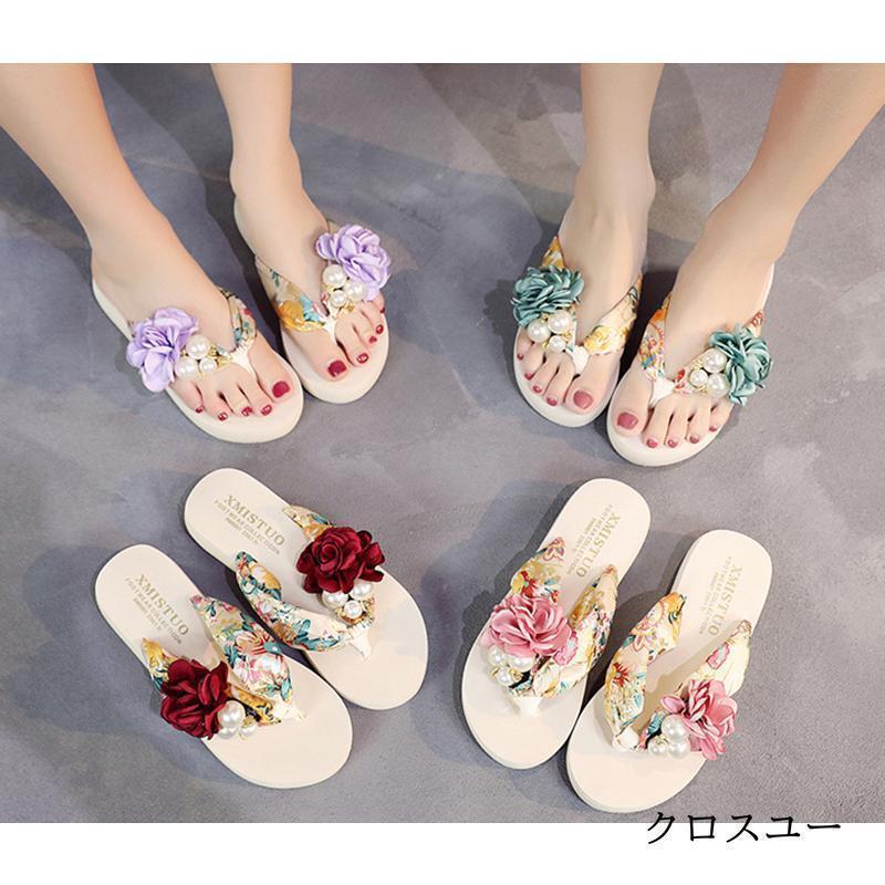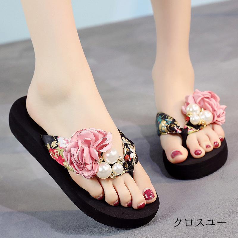 サンダル ビーチサンダル トングサンダル レディース ビーサン 花 フラワー コサージュ フェイクパール カラフル 中底 プール ビーチ デート 海