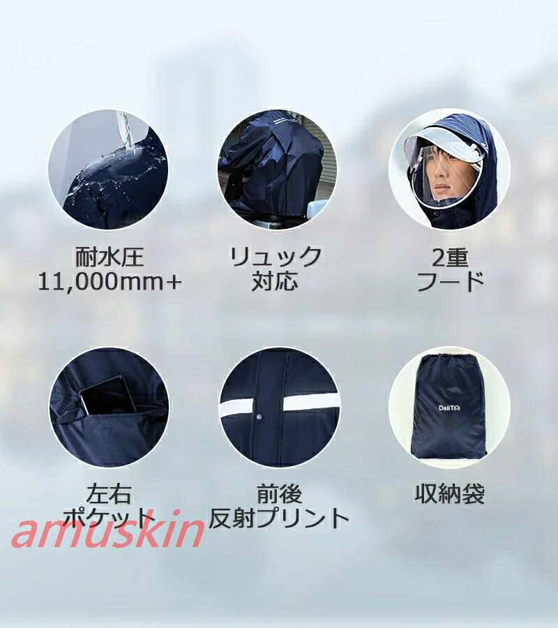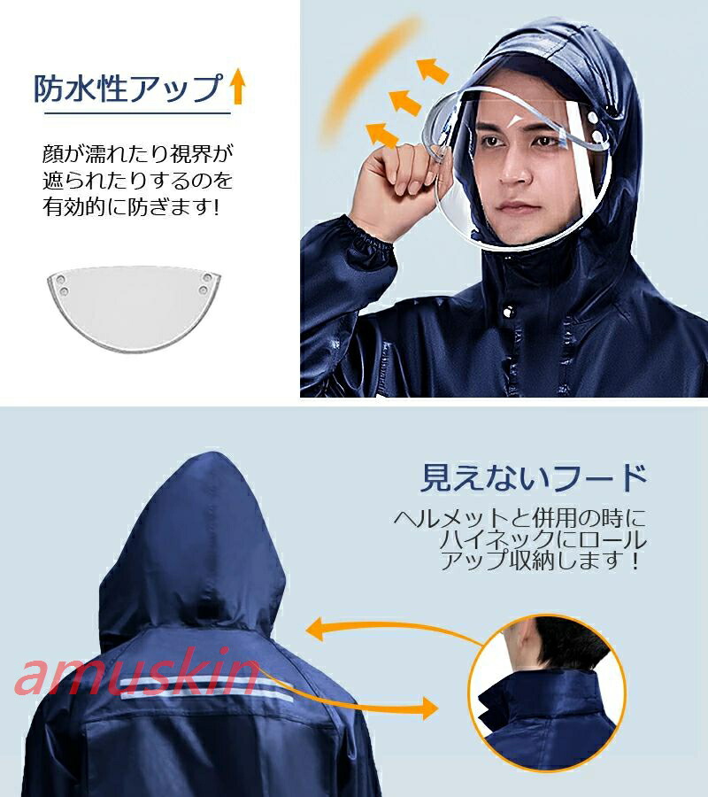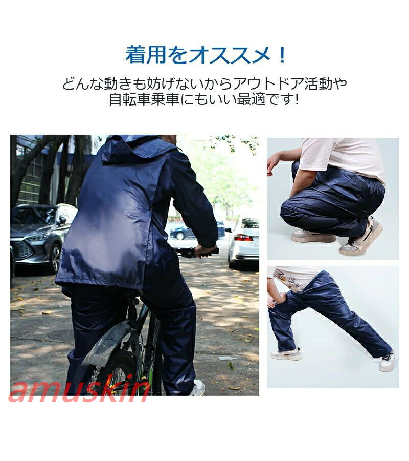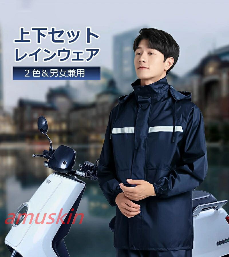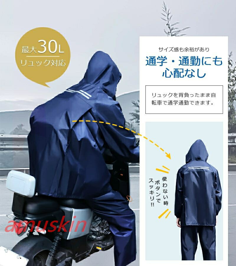レインウェア 上下セット レインスーツ 自転車用レインコート リュック対応収納できるフード付き 通気メッシュ 超撥水 バイク ポケット付き 反射プリント 自転車 通学 通勤用 梅雨対策