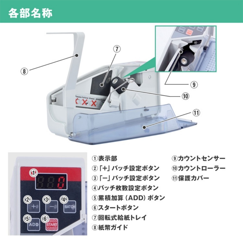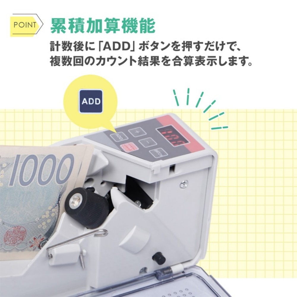 マネーカウンター お札カウンター 紙幣計数機 600枚 分 電池式 累積加算 バッチ機能 枚数指定可能 操作簡単 収納ポ一チ付き 2024年発券 新紙幣対応 金券 各種チケット 事務所 役所 商品券