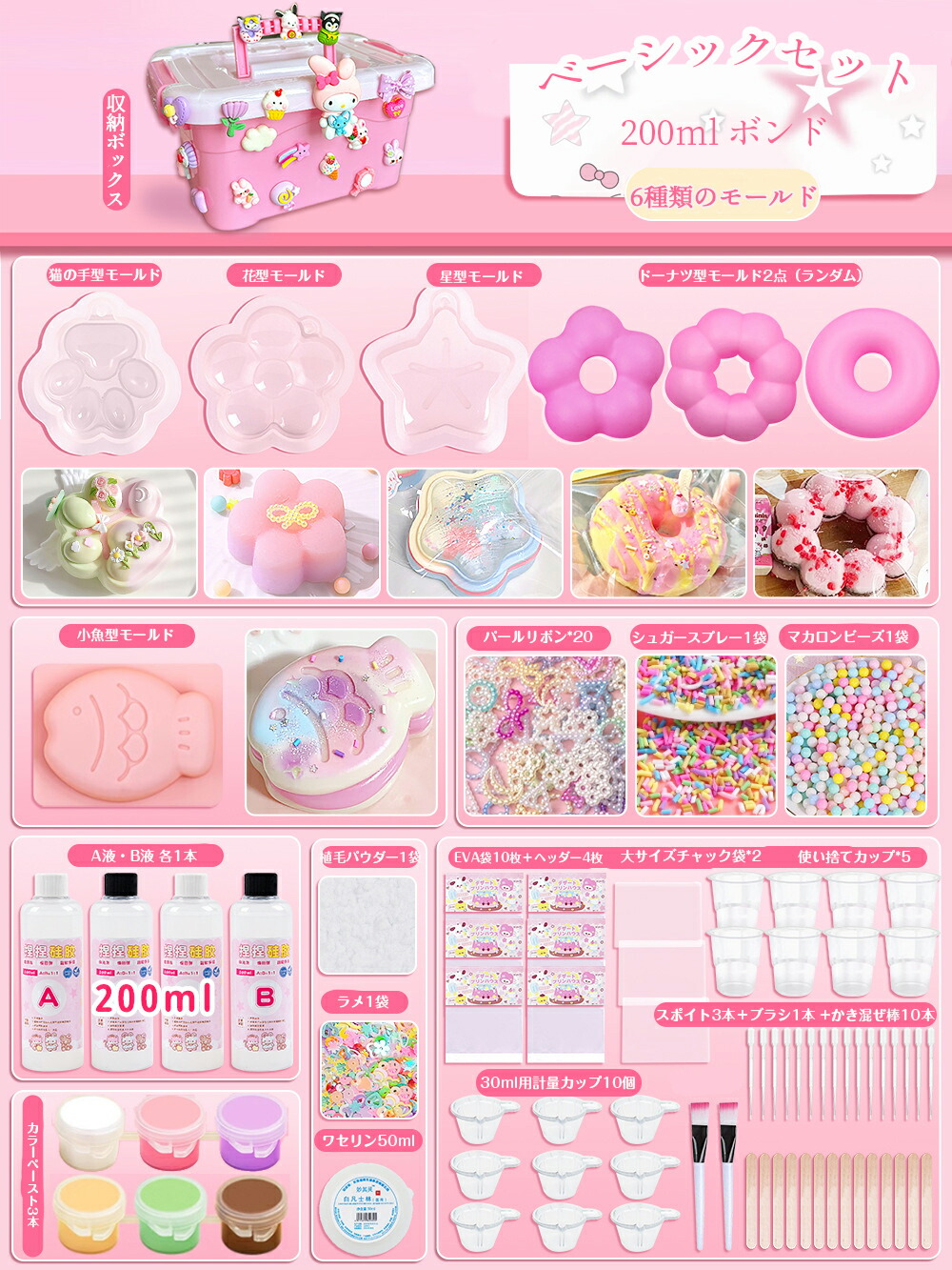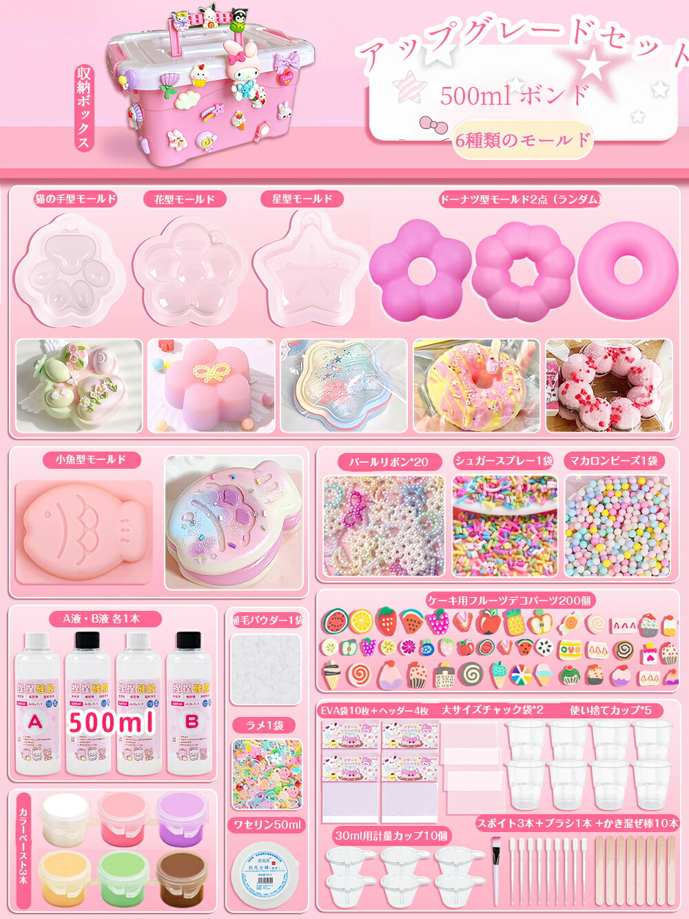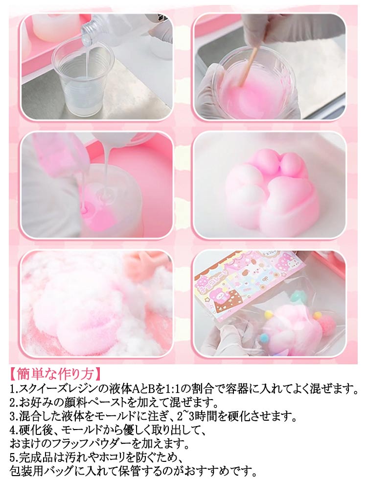 スクイーズ 手作りキット DIY 簡単 成形 樹脂200ml 500mlセット 肉球モールド付き 植毛パウダー 1~4歳 子供用 握れるおもちゃ 液体タイプ