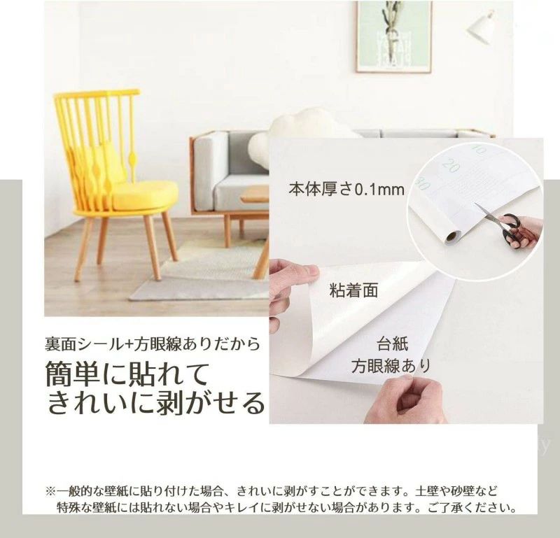 ▼壁紙の状態(経年劣化・湿度・紫外線)や、ペンキ塗装の上、ふすまなどの表面が柔らかい場所に貼った場合、剥がす際に元素材の表面が剥がれたり、糊が残る場合もあります。目立たない所で試してからご利用をおすすめいたします。