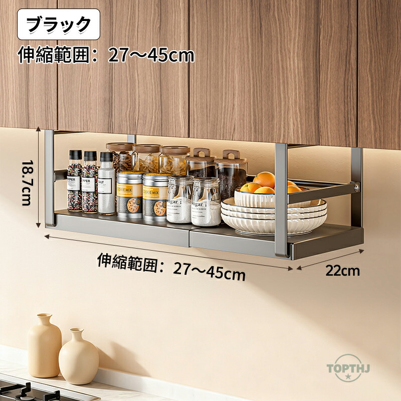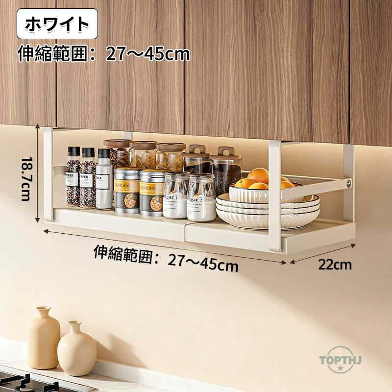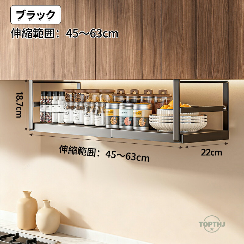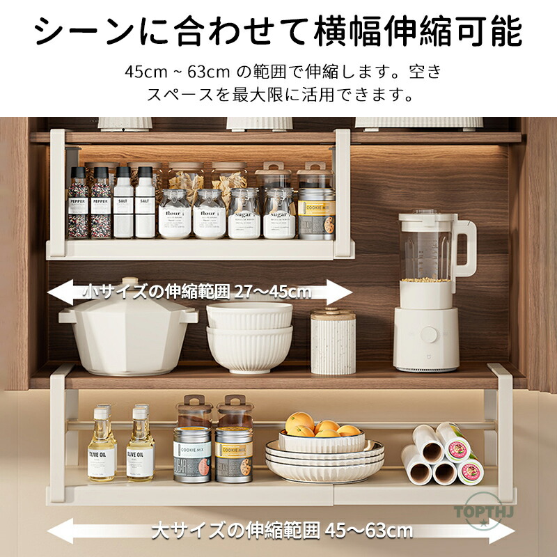 吊り戸棚下収納ラック 伸縮ワイド 戸棚 ブラック ホワイト 伸縮範囲:27~45cm 伸縮範囲:45~63cm