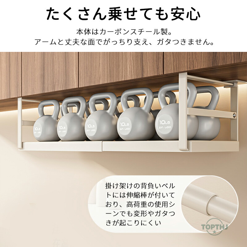 収納物に応じて横幅を45~63cmの間で自由に調整可能な吊り下げラック。さまざまな収納スペースにすっきりと設置でき、空間を有効活用します。