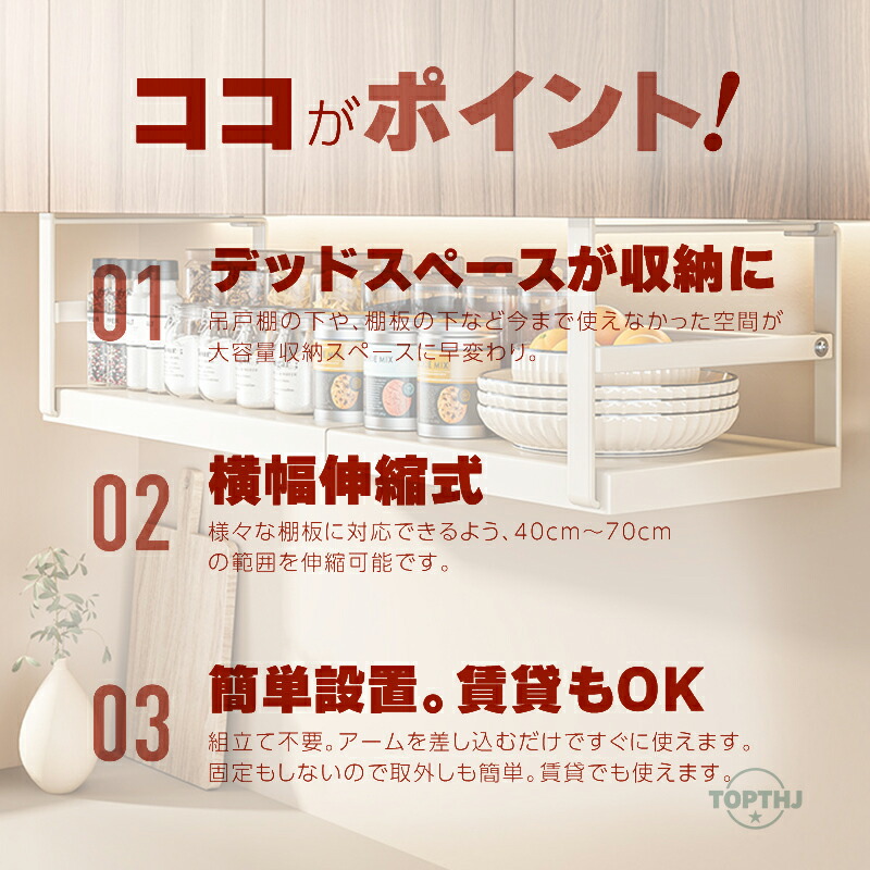 吊り戸棚下収納ラック 伸縮ワイド 戸棚下 ラック キッチン収納 吊り下げ棚 省スペース ホワイト ブラック 差し込み つり戸棚ストッカー 省スペース 洗面所 クローゼット吊り下げ式収納 キッチンラック