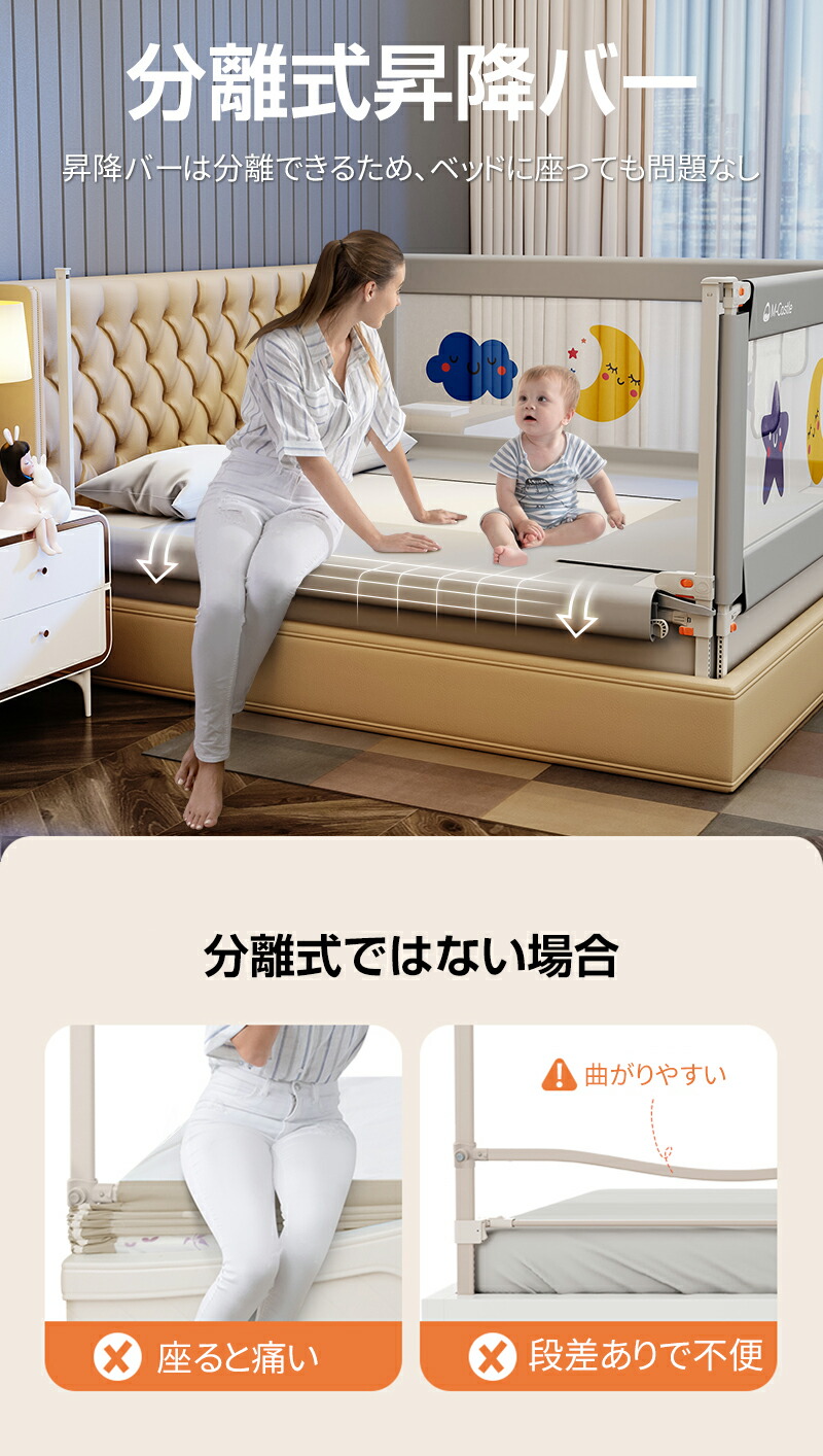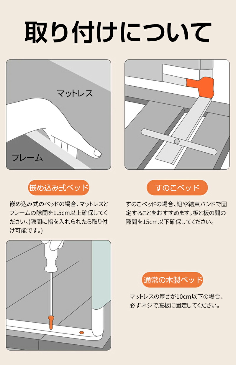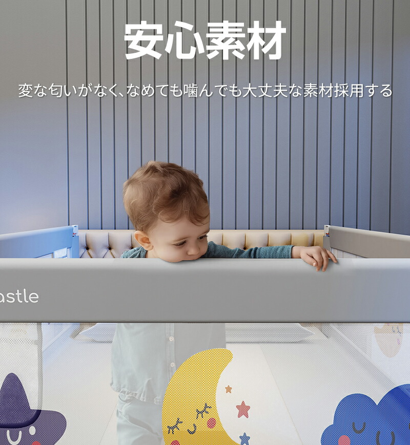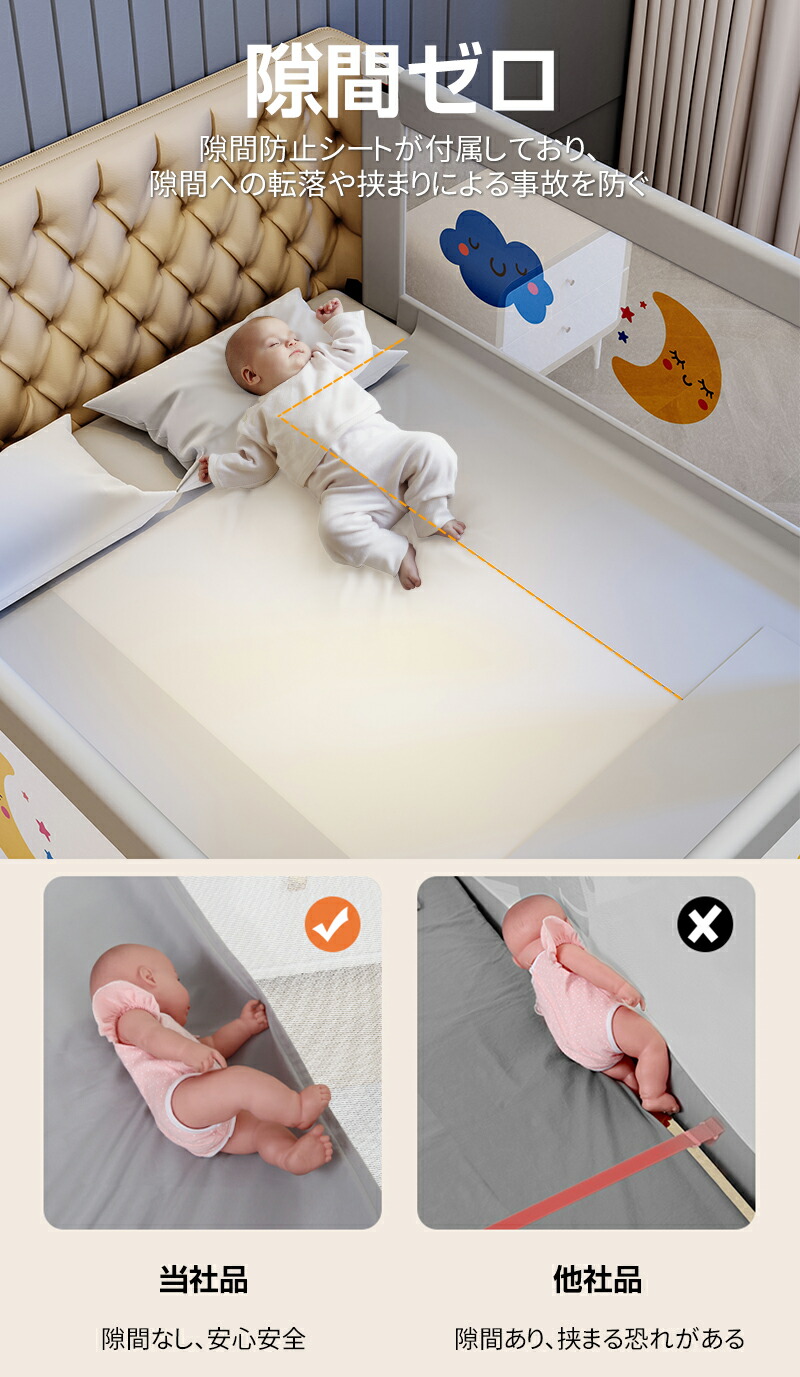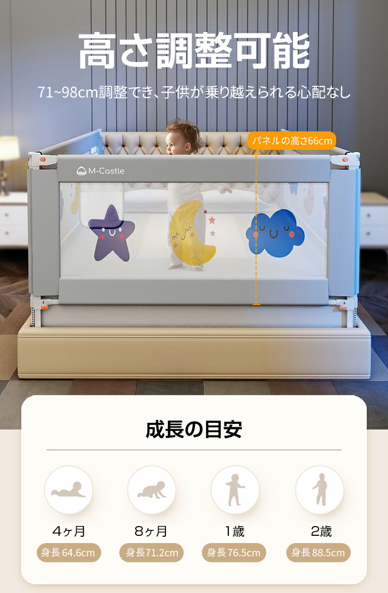 特徴 【高品質安心な素材】環境に優しい材料で作られており。しっかりしている構造で布団を蹴り出しても、ベッドからの転落を心配いりません、メッシュ網で視線を隠せない、赤ちゃんの動きと様子を随時確認でき、安全性も強化されています。 【安定感抜群】30mm肉厚なフレーム採用でしっかり固定できます。 【隙間ゼロ】隙間防止シートが付属しており、隙間への転落や挟まりによる事故を防ぎます。 【高さ調整可能】71~98cm高さ調整でき、子供が乗り越えられる心配なし、28段階調節可能、マットレスの厚さを選ばずに設置でき、マットレスの厚さに合わせてベースの高さを調整できます。 【分離式昇降バー】昇降バーは分離できるため、ベッドに座っても問題なし、赤ちゃんを抱きながら昇降バーを操作できます。 お手入れ方法 本体の汚れは良く薄めた中性洗剤を布に濡らして拭き取り、乾いた布で水分を拭き取ってください。 金属部分は錆を防ぐために水濡れを避けてください。 研磨剤、溶剤(ベンジン、シンナーなど)は決して使用しないでください。 本体をスモッグ、水、雨、雪などにさらさないよう注意してください。 本体を長時間、直射日光に当てたり、湿気の多い場所に放置したりしないでください。 本体は乾燥している場所に保管してください。 定期的に各部分が緩んでいないか、部品が壊れていないか点検してください。
