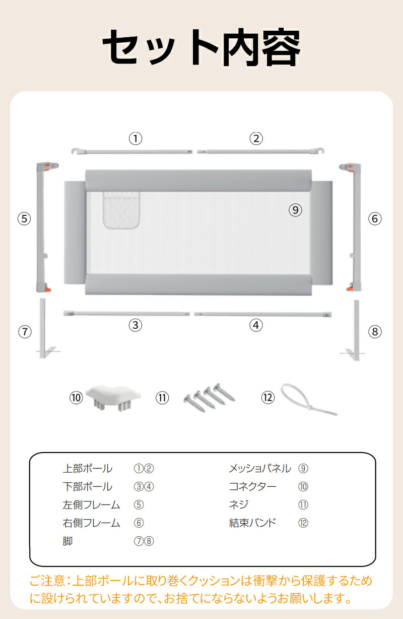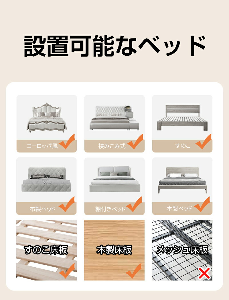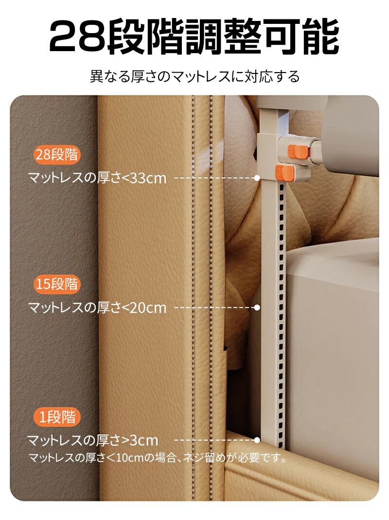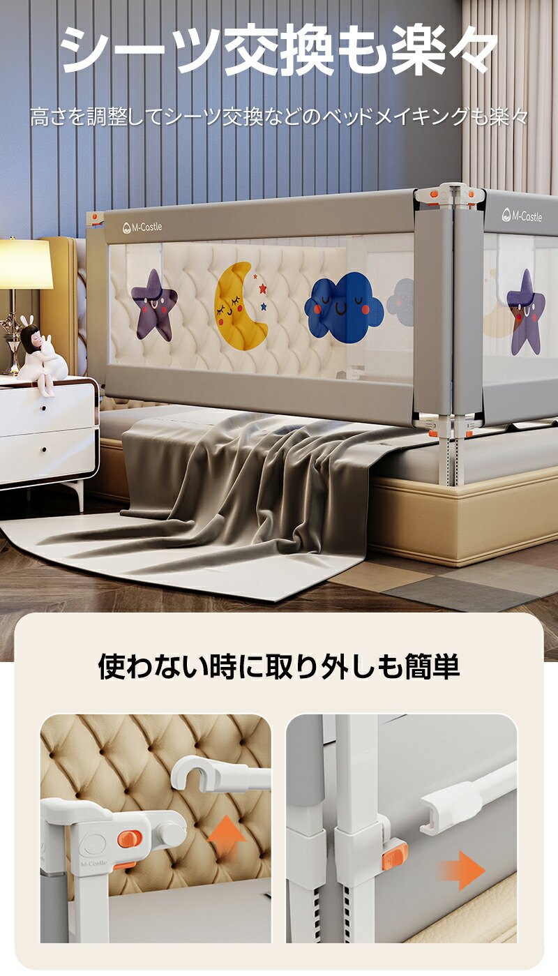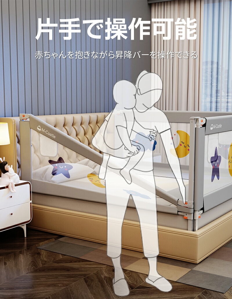 特徴 【高品質安心な素材】環境に優しい材料で作られており。しっかりしている構造で布団を蹴り出しても、ベッドからの転落を心配いりません、メッシュ網で視線を隠せない、赤ちゃんの動きと様子を随時確認でき、安全性も強化されています。 【安定感抜群】30mm肉厚なフレーム採用でしっかり固定できます。 【隙間ゼロ】隙間防止シートが付属しており、隙間への転落や挟まりによる事故を防ぎます。 【高さ調整可能】71~98cm高さ調整でき、子供が乗り越えられる心配なし、28段階調節可能、マットレスの厚さを選ばずに設置でき、マットレスの厚さに合わせてベースの高さを調整できます。 【分離式昇降バー】昇降バーは分離できるため、ベッドに座っても問題なし、赤ちゃんを抱きながら昇降バーを操作できます。 お手入れ方法 本体の汚れは良く薄めた中性洗剤を布に濡らして拭き取り、乾いた布で水分を拭き取ってください。 金属部分は錆を防ぐために水濡れを避けてください。 研磨剤、溶剤(ベンジン、シンナーなど)は決して使用しないでください。 本体をスモッグ、水、雨、雪などにさらさないよう注意してください。 本体を長時間、直射日光に当てたり、湿気の多い場所に放置したりしないでください。 本体は乾燥している場所に保管してください。 定期的に各部分が緩んでいないか、部品が壊れていないか点検してください。