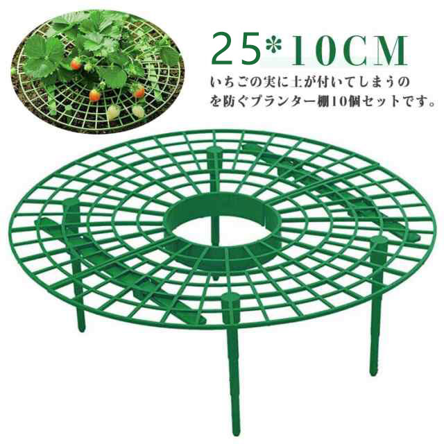 いちごの実に土が付いてしまうのを防ぐプランター棚10個セットです。 つるや茎の誘引が簡単にでき、果実を土から離すことにより、汚れや虫、菌などから護り、イチゴの熟成を促進させます。 プラスチック製で簡単に組立てができ、ネット状なので、水やりにも邪魔になりません。 ベランダやバルコニーでのガーデニングにも適しております。イチゴだけでなく、トマトやナスなどにもお使いいただけます。