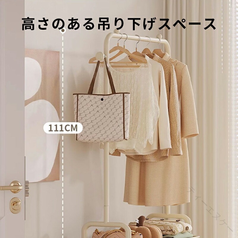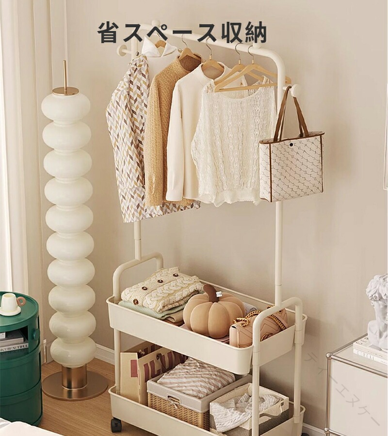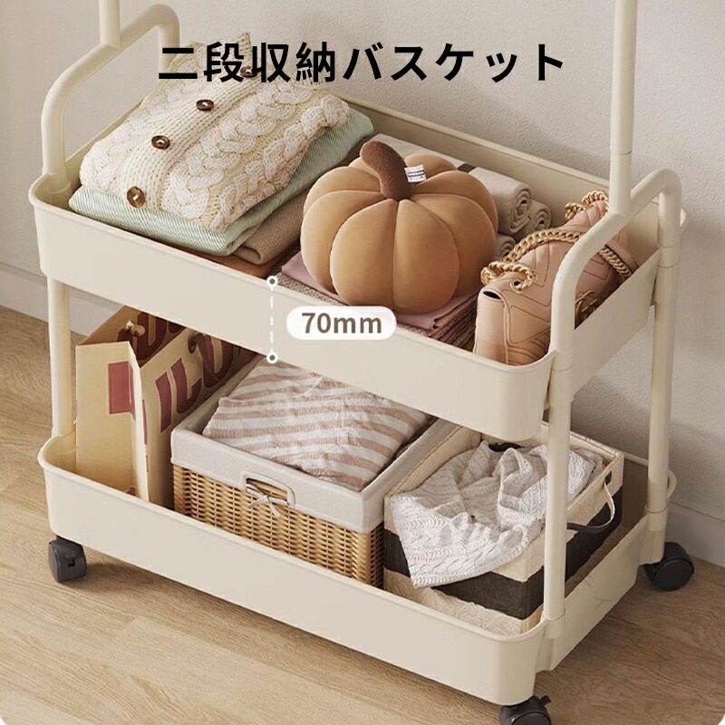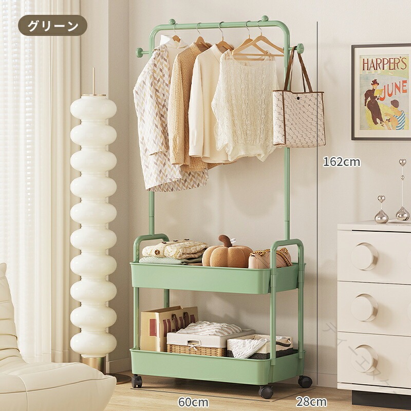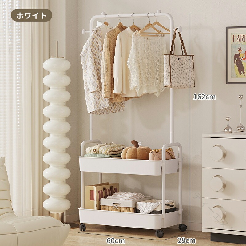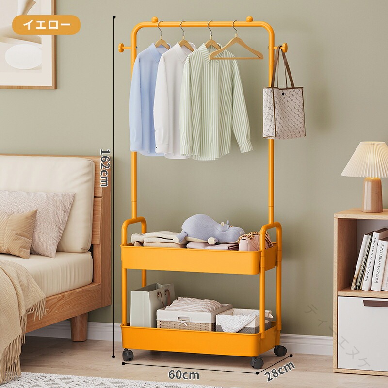 ◆【商品説明】省スペース収納設置に必要なスペースはわずか(幅 60cm× 奥行 28cm)!狭い賃貸や小さなワンルームでも、コンパクトに収納でき、生活空間を有効活用できます。高さのある吊り下げスペース吊り下げ部分の高さは約 111cm!長めのワンピースやコートもたるませることなく、自然に垂らせます。皺が付きにくく、アイロンが不要な手間を省けます。二段収納バスケット下段の収納バスケットは、長さ 60cm× 幅 26cm× 高さ 7cm の大容量。畳んだ服や小物入れ、ストレージボックスを自由に配置でき、見た目もすっきり整理できます。360° 回転キャスター(ロック付き)自在に移動できる 360° 回転キャスター搭載!掃除の際やレイアウト変更時にスムーズに動かせます。不用意に動かないよう、ロック機能付きで安心です。選べるカラーバリエーション「ホワイト」「ブラック」「イエロー」「グリーン」「ベージュ」の 5色展開。お部屋のインテリアに合わせて、自分好みのカラーを選べます。耐久性のある素材メインフレームは「焼き付け塗装ステンレスパイプ」、収納バスケットは「PP プラスチック」を使用。軽量だけど丈夫で、長期間の使用にも耐えられます。【注意事項】※製品更新により、予告なしで同じ商品がデザイン、色若干変わる場合がございますので、予めご了承下さい。※撮影の為、画質等の関係上、色などが実際の商品と若干違ってしまうこともあるかもしれませんがご理解のほどご購入ください。予めご了承ください。※更新のタイミングによっては実在庫に相違が出る場合がございます。※万が一商品に不具合がある場合は、無償交換・返金は可能です。マイナス評価する前にご遠慮なく当店と連絡してください。※重要※<オプション品ご購入の注意点>