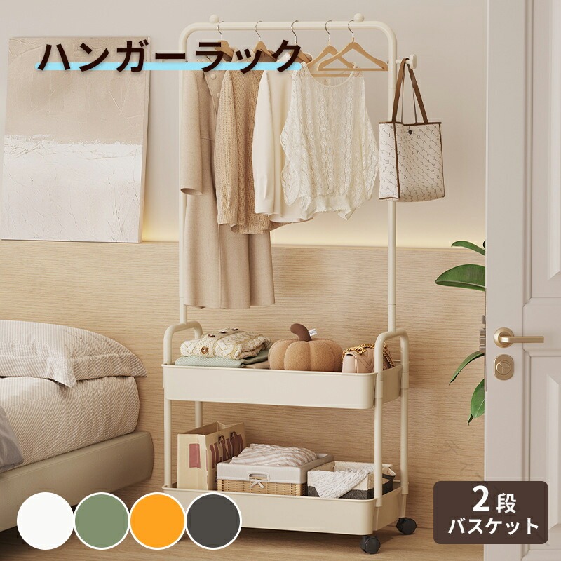 ハンガーラック パイプハンガーラック スリム 2段 バスケット キャスター付き 頑丈 おしゃれ 大容量 洋服ラック 洋服ハンガー コート掛け 物干しスタンド 省スペース 組立簡単 衣類収 メタルラック