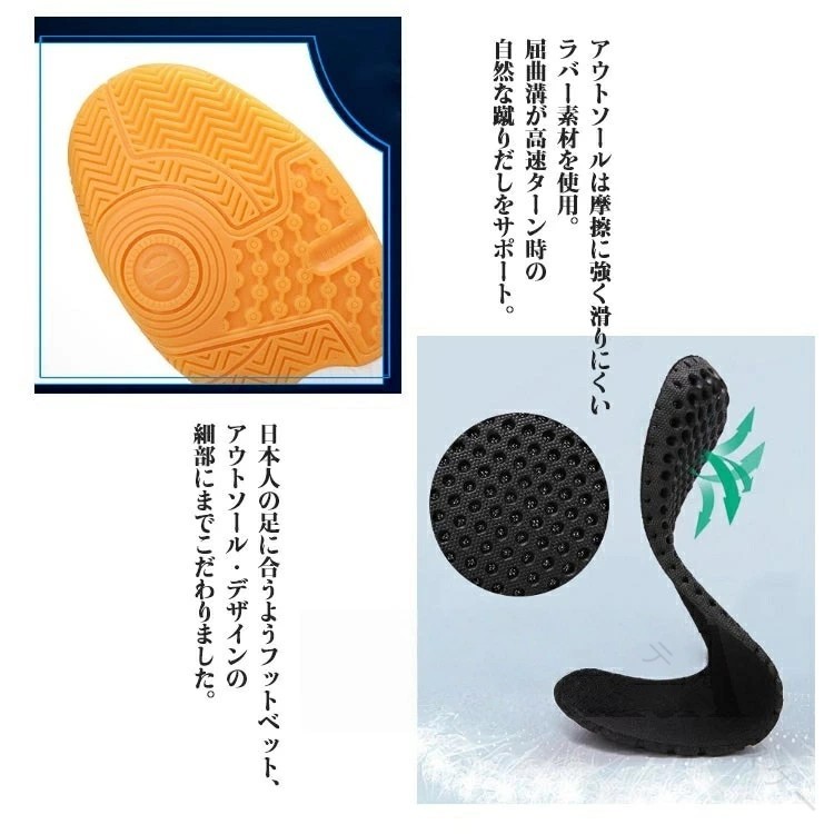 ストレスフリーな履き心地でスピードプレーに瞬時に対応できるバドミントンシューズ 親指の圧迫感を解消した指先ゆったり設計。 アッパー部には通気性を向上させる通気穴を使用。 日本人の足に合うようフットベット、アウトソールデザインの細部にまでこだわりました。足全体とのフィット感も向上し、快適な履き心地。 アウトソールは摩擦に強く滑りにくいラバー素材を使用。屈曲溝が高速ターン時の自然な蹴りだしをサポート。 バドミントン、卓球、バレーボールなど、様々なスポーツシーンで大活躍間違いなし。