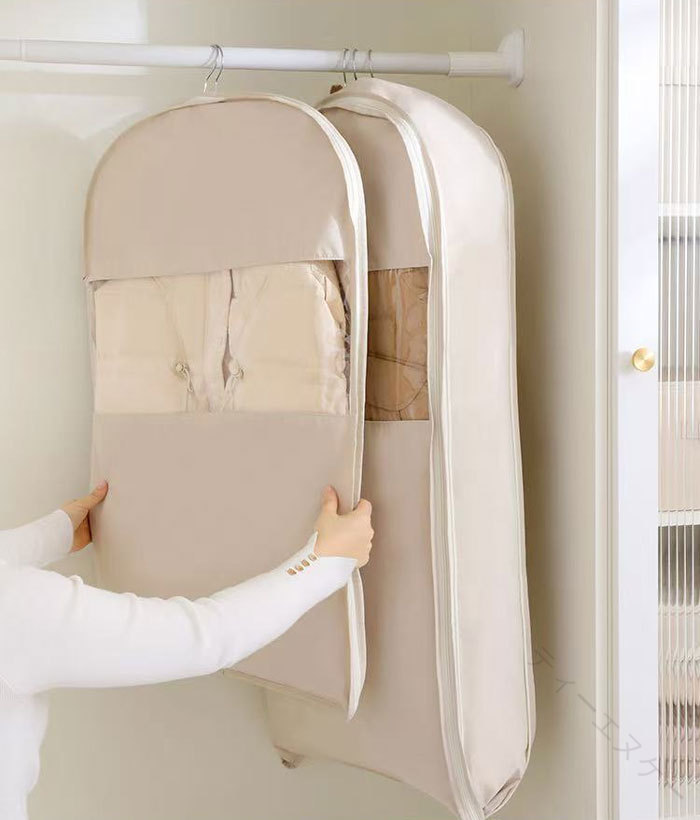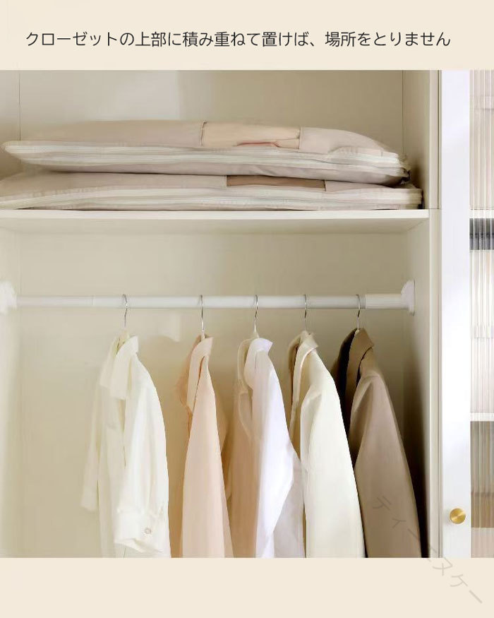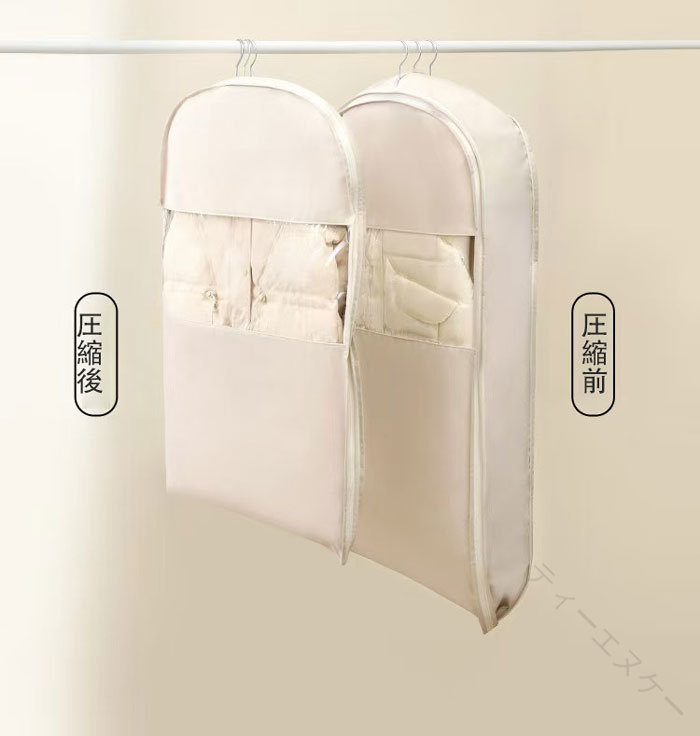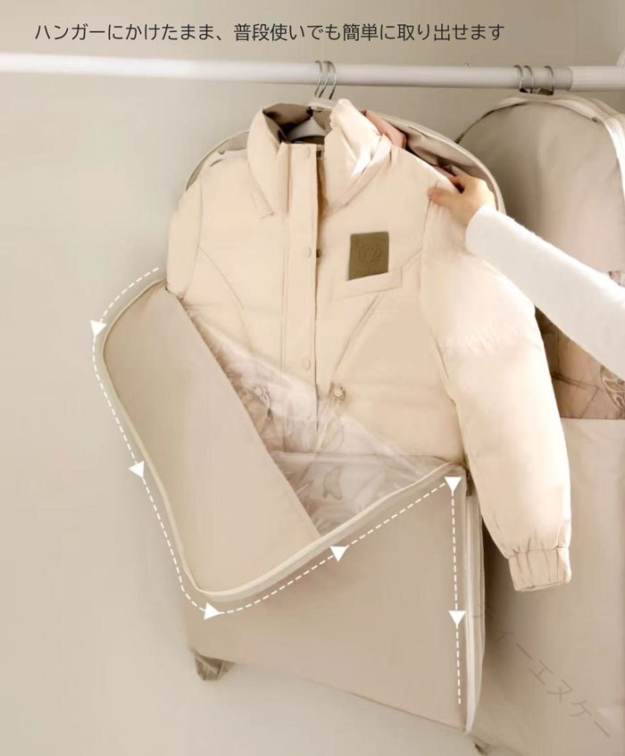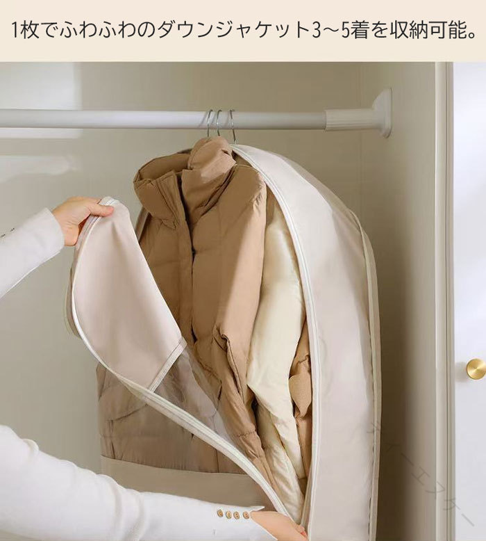 ファスナーを締めるだけで、スペースを約40%節約することができ、クロゼットの中がスッキリ。 通気穴があり、ダウンにダメージを与えず、ダウンコートの保温力はそのままスッキリ収納できる一押しアイテムです。 取っ手が付いているので持ち運ぶ時とても便利。 水洗いできるから、いつでも清潔に保つことが出来ます。