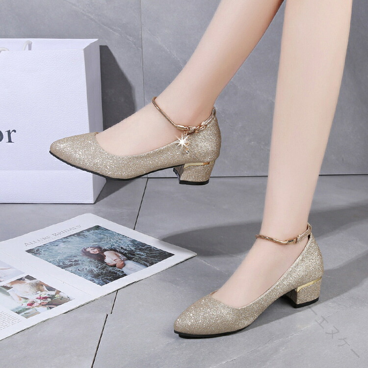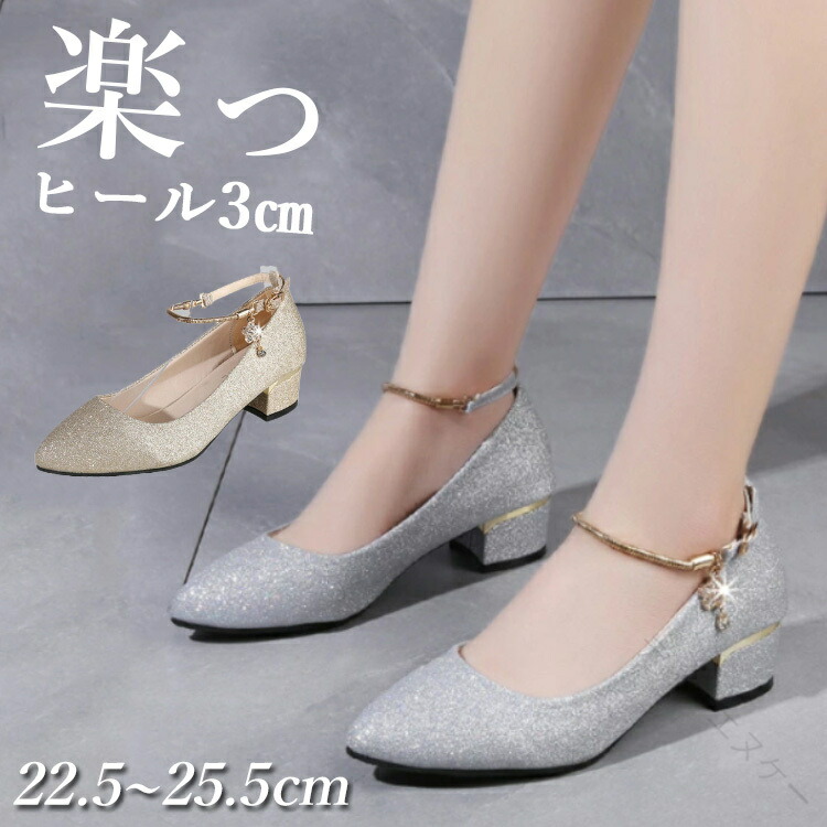 発表会 シューズ パンプス ローヒール 3cm 太ヒール ストラップ 疲れない 歩きやすい 履きやすい 痛くない キラキラ 大きめ レディース ブライダルシューズ 結婚式 ゴールド 黒 女の シルバー