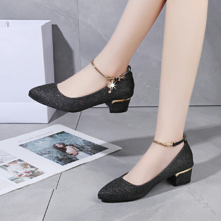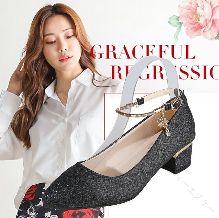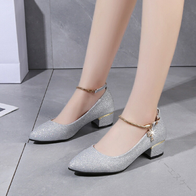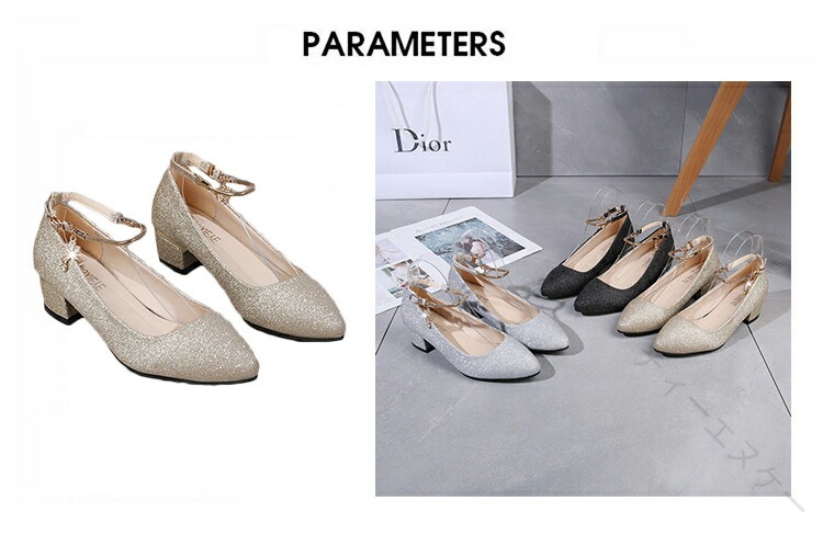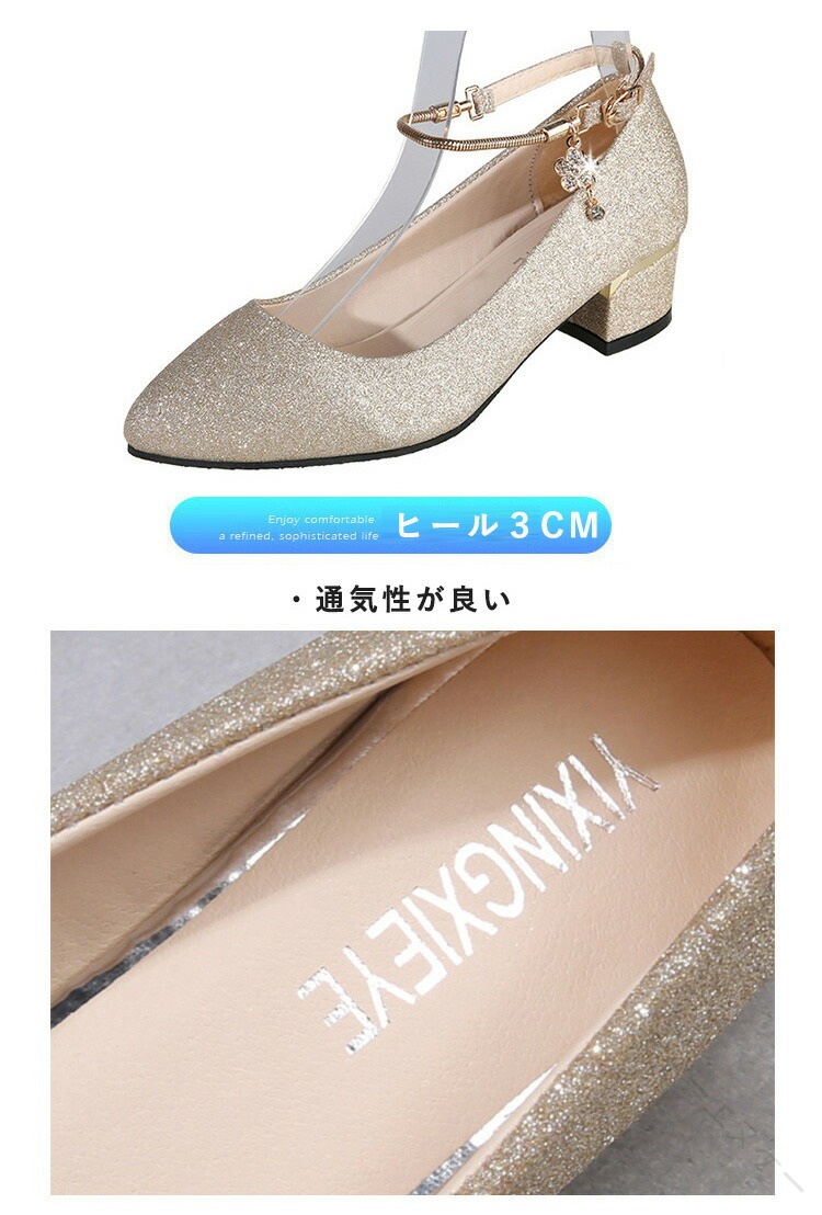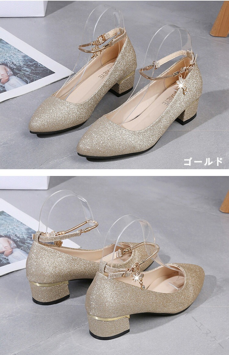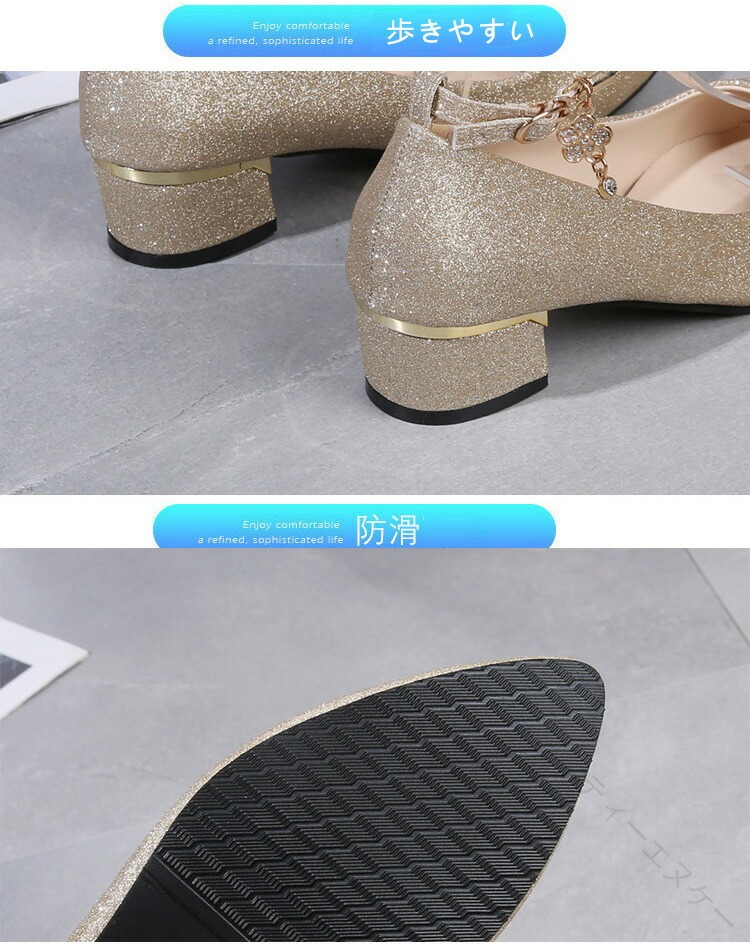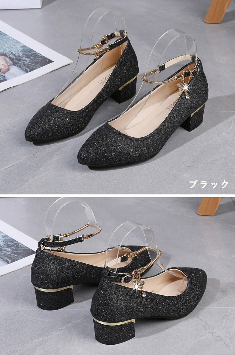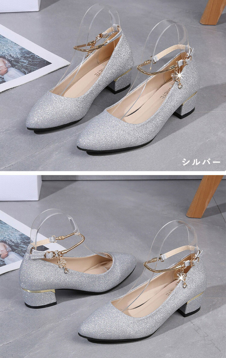 .発表会 や 結婚式 に 最適 な パンプス シューズ です。ローヒール 3cm と 太ヒール で 歩きやすく 疲れない 設計。ストラップ 付き で 履きやすく 痛くない キラキラ デザイン が 特徴。シルバー ゴールド 黒 の カラー バリエーション を 用意し、 大きめ サイズ も ある ため レディース や 女の子 に ぴったり の ブライダルシューズ としておすすめです。。