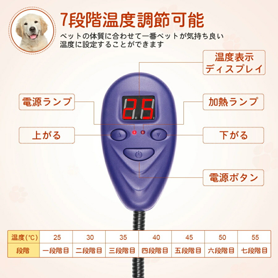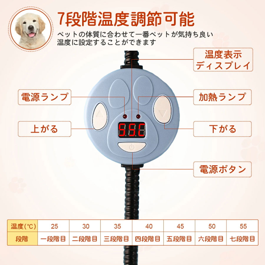 25~55℃、7段階の温度調節が可能です。(40度オススメ)季節によって温度を使い分けられるのも便利です。 ペットがあまりにも暑すぎたり、寒すぎたりしても心配しないでください。