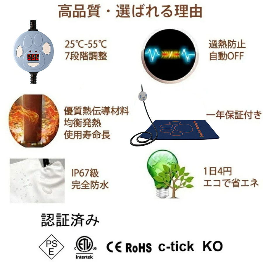 PSE認証済み、IP67防水仕様なので24時間つけっぱなしてもOKです。過熱防止、噛み防止、感電防止、水漏れ防止、ペットのおしっこ防止の5つ安全設計により、いつもご安心してお使いいただけます。