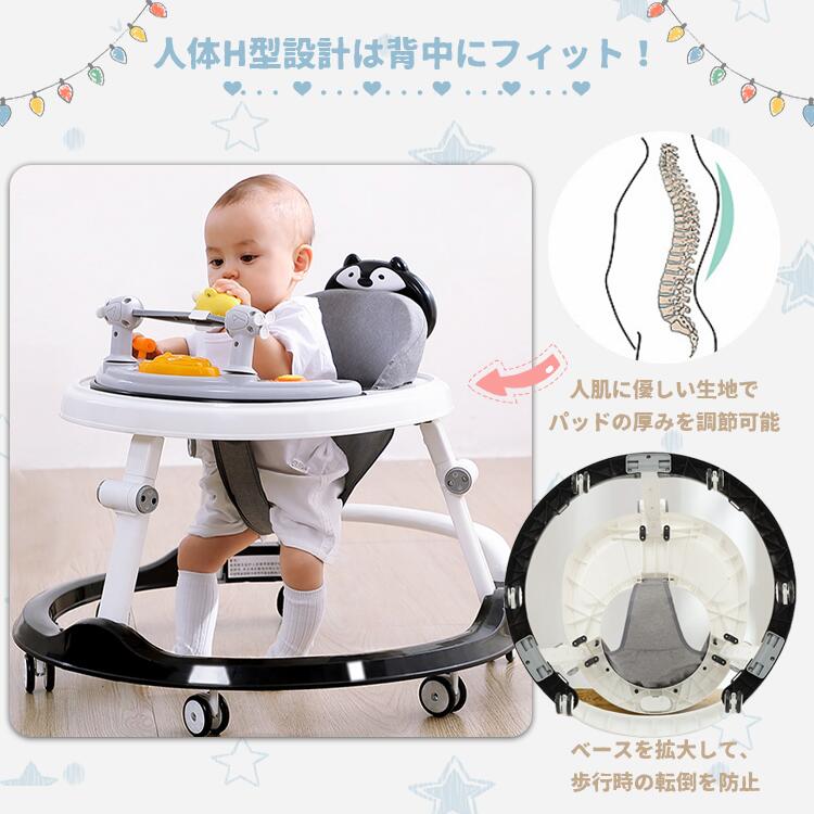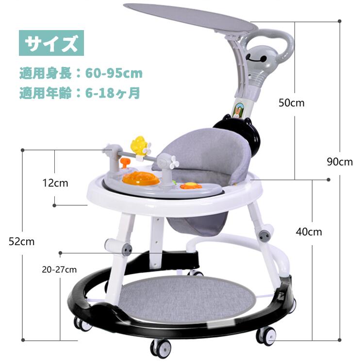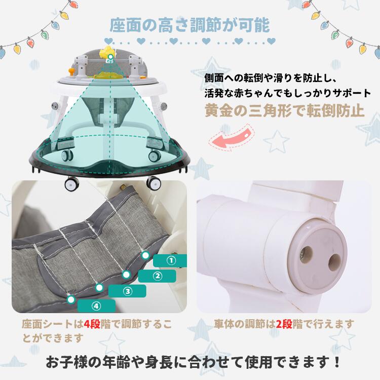 転倒防止機能と高さ調節可能なデザインで、6-18 ヶ月のつかまり立ちから歩行訓練まで安心使用。静音仕様で家庭環境に優しく、セーフな構造でママも安心してお任せ OK!