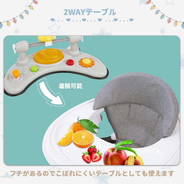 メロディボード付きで歩行中も楽しみながら感性を養い、取り外し可能な食卓で離乳食タイムにも活用。手押し車としての機能も備え、お座りタイムから歩行サポートまで多シーンで活躍!