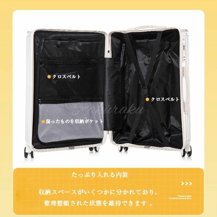 【内部収納に便利・仕切り設計】:スーツケースの収納性能が非常に高く、初心者の方から旅慣れた方まで幅広くご利用頂けるスーツケースです、箱の空間を合理的に最適化します。荷物を固定する止めボタンががあり、荷物が散らかってなくなる恐れがありません。
