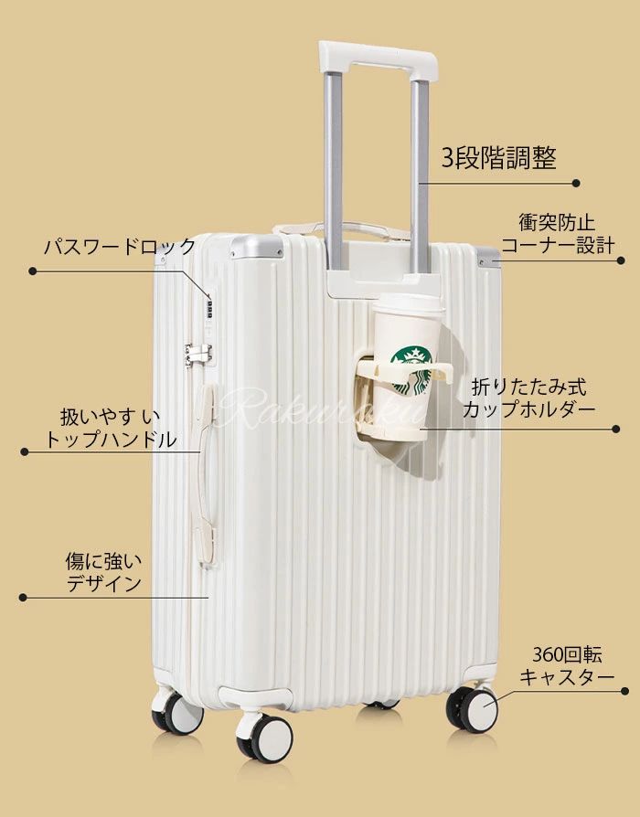 【隠しフック・三段調節ハンドル】:隠しフックがあります。手提げ袋や小物を掛ける際に、スーツケースに傷がつくのを防ぐことができます。また、アルミニウム製の超軽量のキャリバーは伸縮可能で、ご自分の身長に合わせて、スムーズな3段階調整が可能です。上品な質感と耐久性を兼ね備え、耐久性を向上させあます。