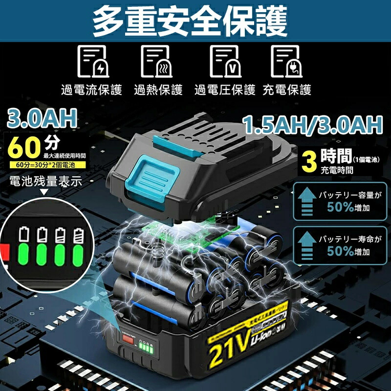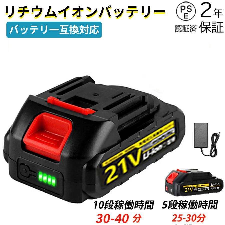 バッテリー 21V 大容量 長時間作業可能 充電式 リチウムイオンバッテリー 電動工具用バッテリー 小型 軽量 PSE認証済み 多数保護機能搭載