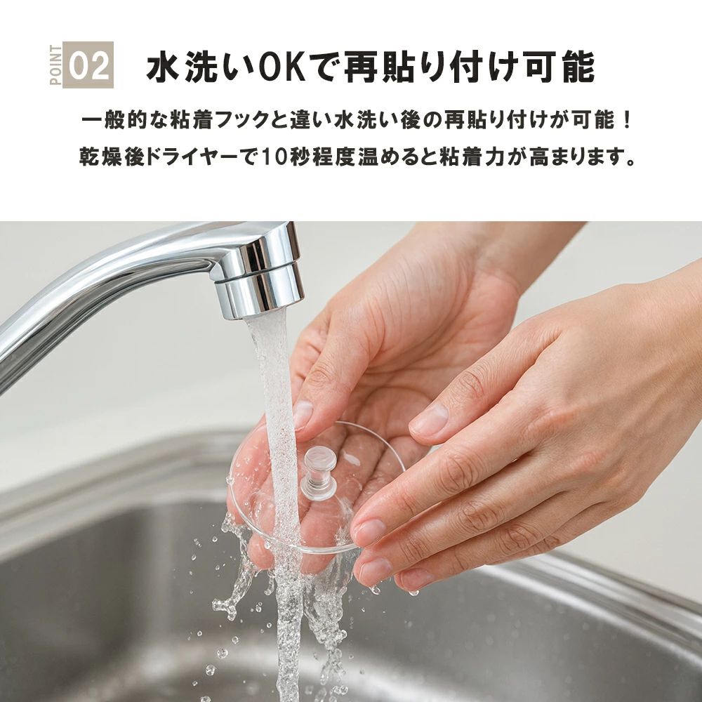 貼り直しもOK。吸盤を水洗いして自然乾燥させると粘着力が戻ります。乾燥後にドライヤーの温風で10秒ほど軽く温めると、再密着がスムーズです。季節の模様替えや引っ越しでも繰り返し使えるので、コスパを重視する方にぴったりでしょう。