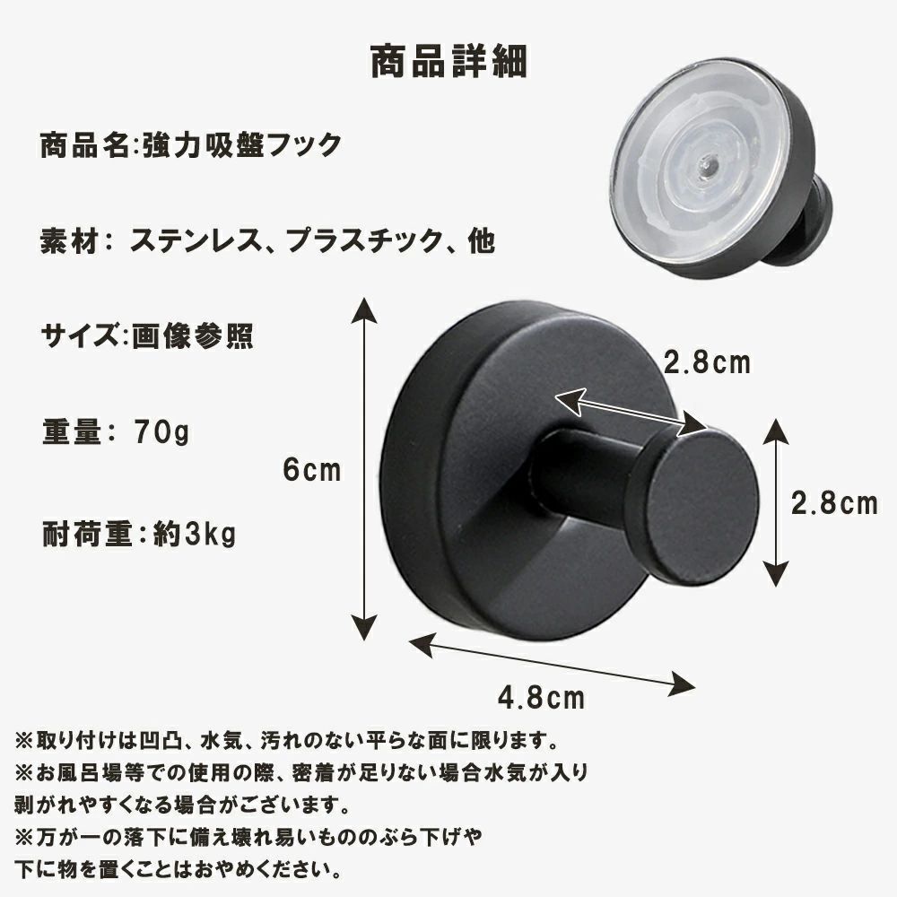 サイズは直径約6cm、フックの突き出し約2.8cm、重量約70g。日々の使い勝手を損なわないコンパクトさです。耐荷重は約3kgの目安ですが、取付面の状態や温度、荷重のかけ方で保持力は変動します。高価品や壊れやすい物の吊り下げ、ぶら下げたままの強い衝撃はお控えください。