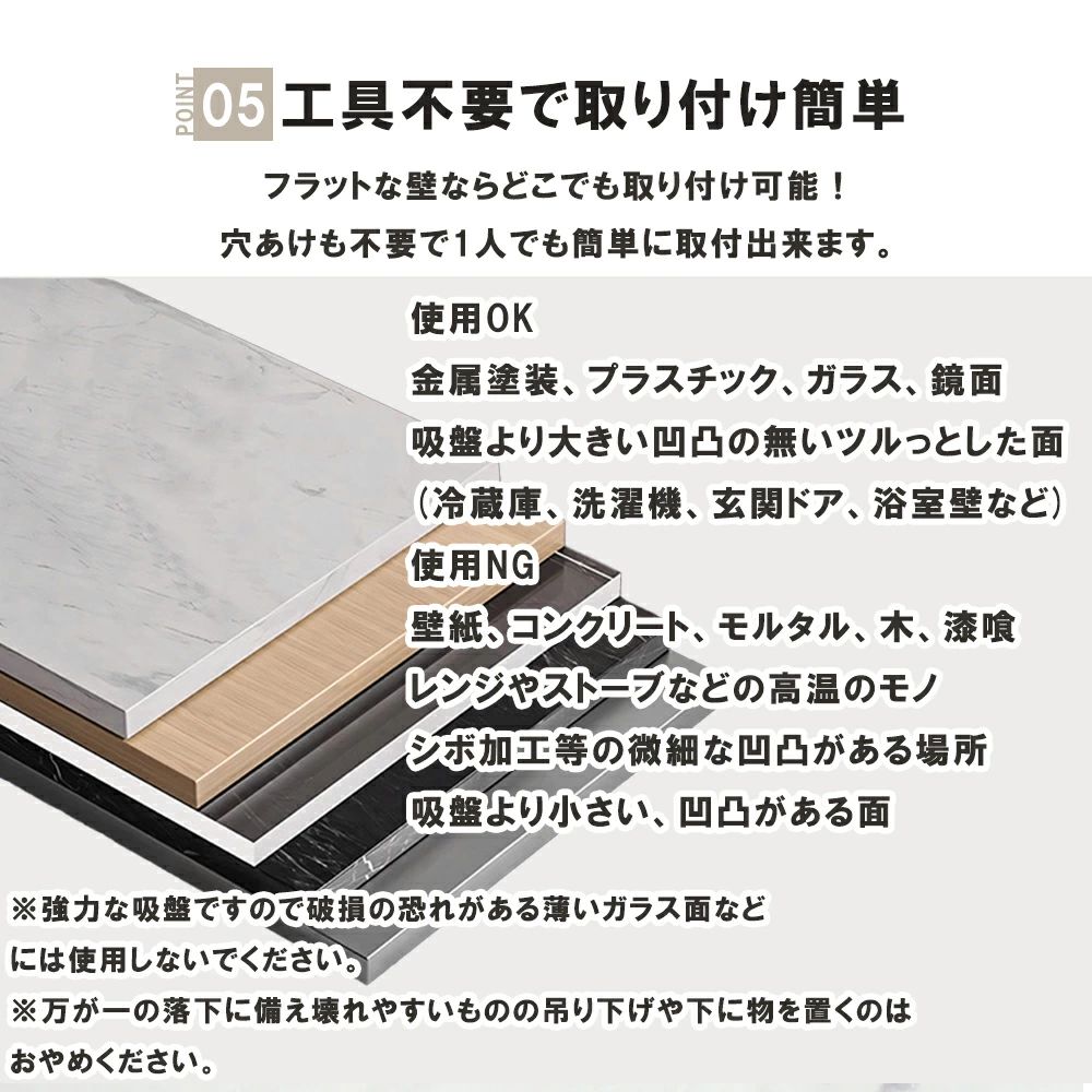 注意事項:耐荷重は約3kgの目安です。取付面の状態や温度で保持力は変動します。