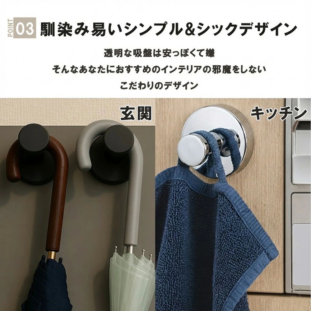 吸盤フック 強力おしゃれ 浴室 玄関 キッチン 洗面所 簡単 工具不要 貼り直し再利用 防錆 防水 ステンレス モノトーン 賃貸 穴あけ不要 ガラス 鏡 冷蔵庫 玄関ドア 小物掛け タオル掛け 傘フック 2個セット 4個セット