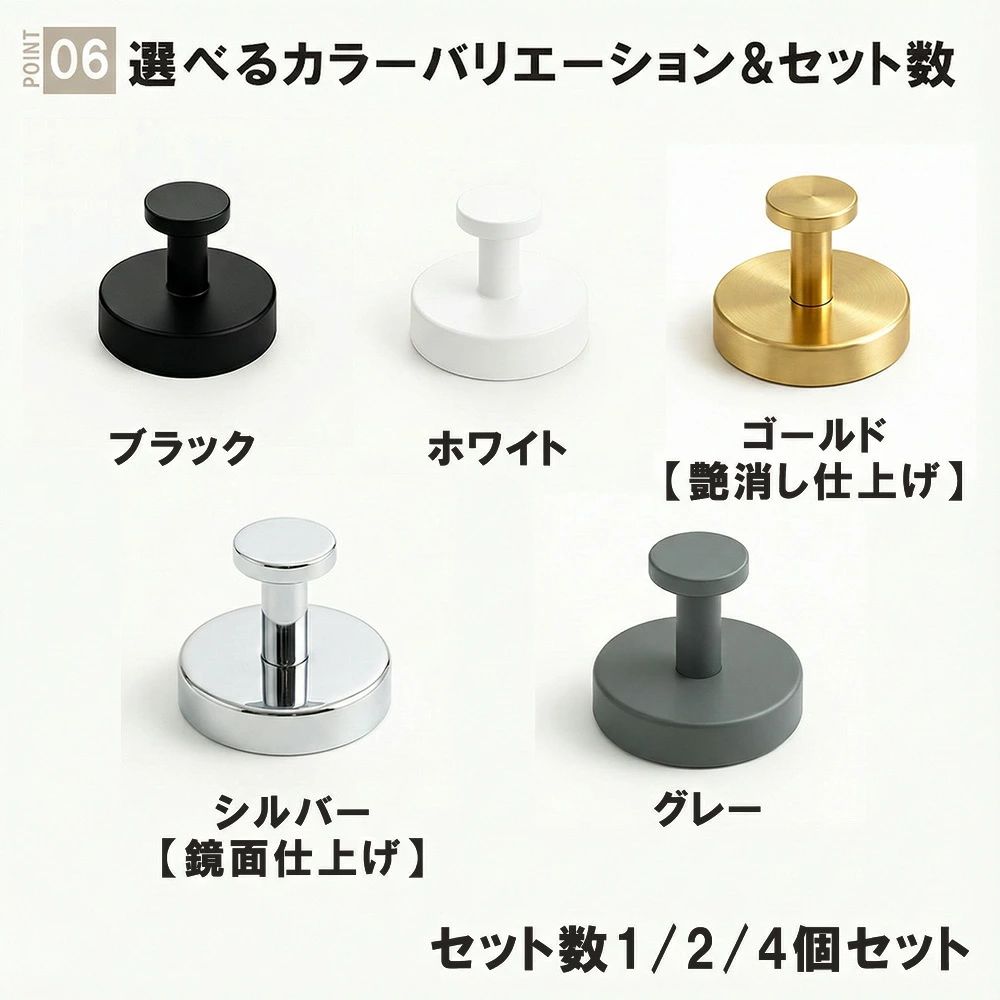 見た目にもこだわりました。ブラック/シルバー/ホワイトに加え、空間になじむグレーもラインアップ。玄関や浴室のトーンに合わせて選べます。セットは1個・2個・4個をご用意。必要な数だけ購入でき、まとめ買いで複数箇所をすっきり整えられます。