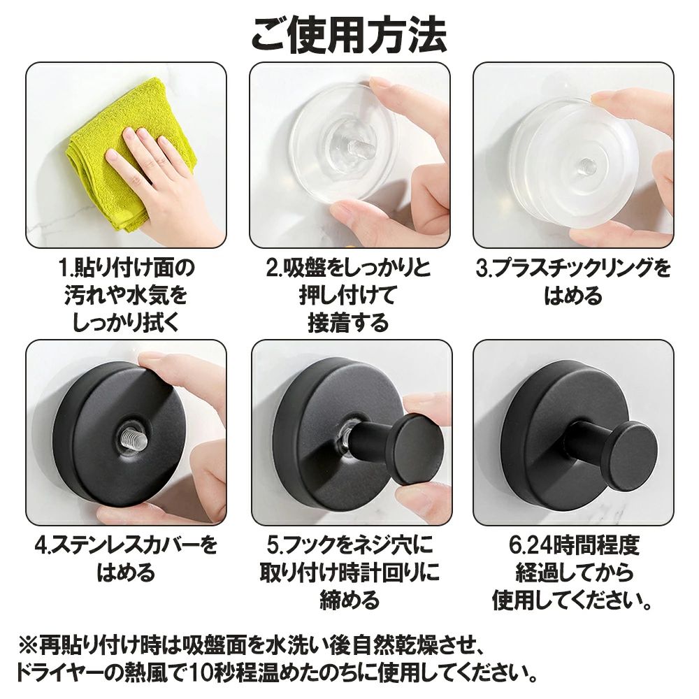 取り付けは簡単です。貼り付け面の汚れや水分を拭き取り、吸盤を強く押し当てて密着させます。付属カバーをはめ、フックを時計回りにねじ込めば固定完了。安定させたい場合は、設置後24時間ほど置いてから荷重を掛けると安心です。