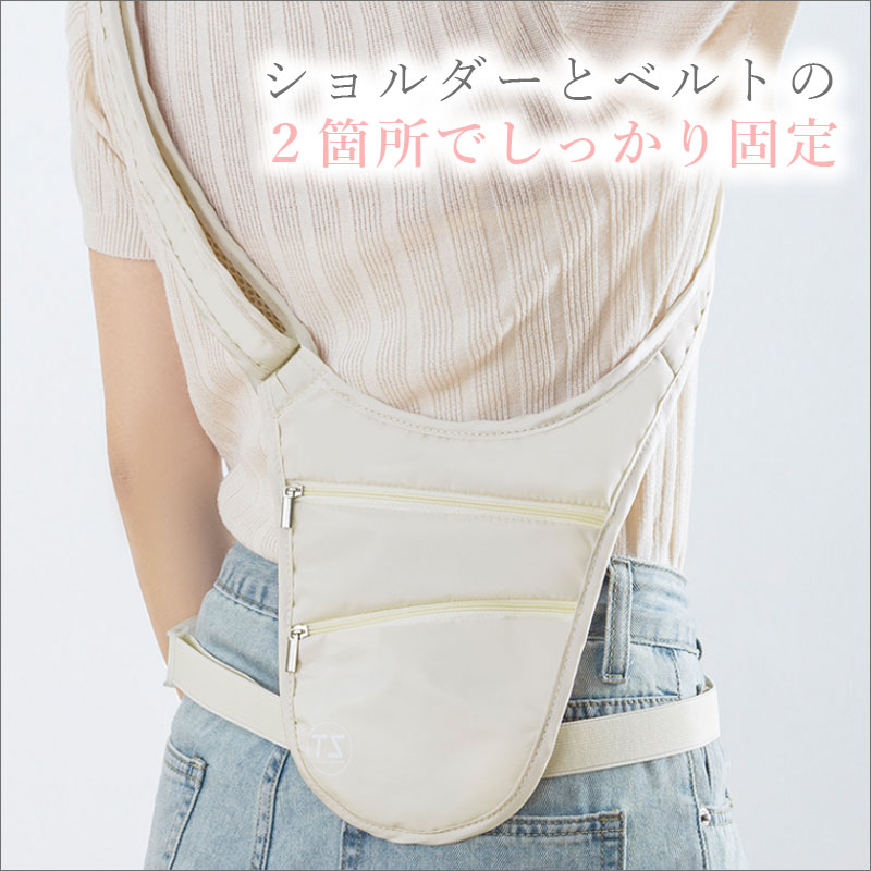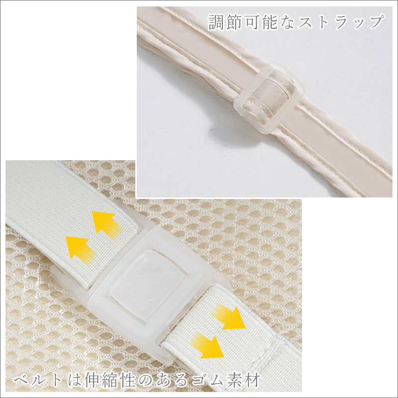 【しっかり固定】 長さ調整可能なショルダーストラップとウエストのゴムベルトで、しっかりと固定できます。