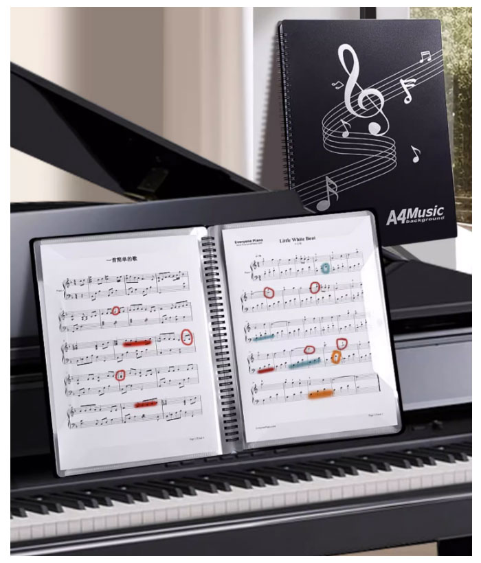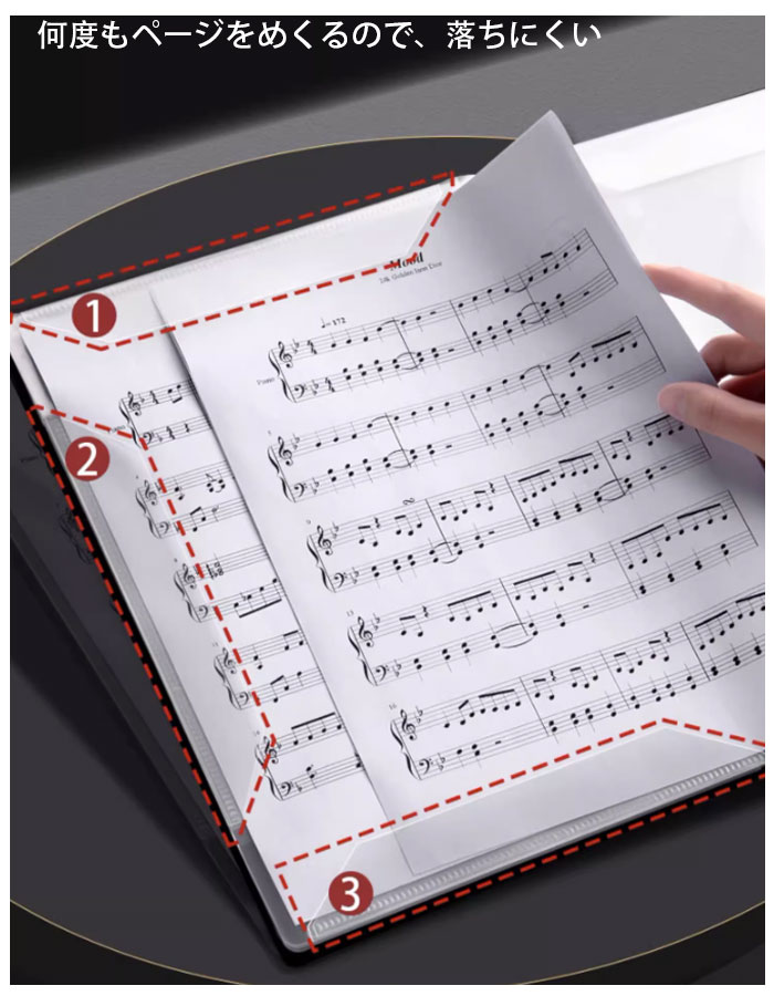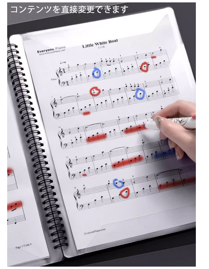 楽譜をポケットに入れるのではなく上下.横側で挟むタイプのファイルなので、楽譜を取り出すことなく書き込めます。授業や練習でもすぐにメモ出来てとても便利です!