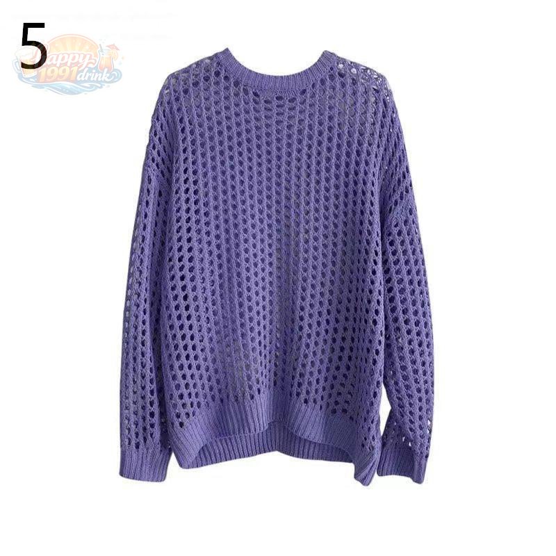 穴あきニットサマー ニット ス 春夏秋 メッシュニット セーター 長袖 丸首 リブ編み クルーネック 重ね着 レイヤード