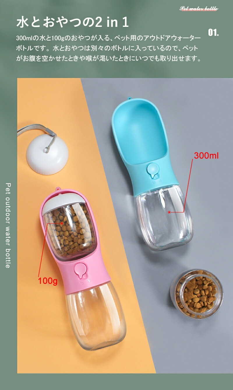 ・【水とおやつの2in1ボトル】300mlの水と100gのおやつが入る、ペット用のアウトドアウォーターボトルです。