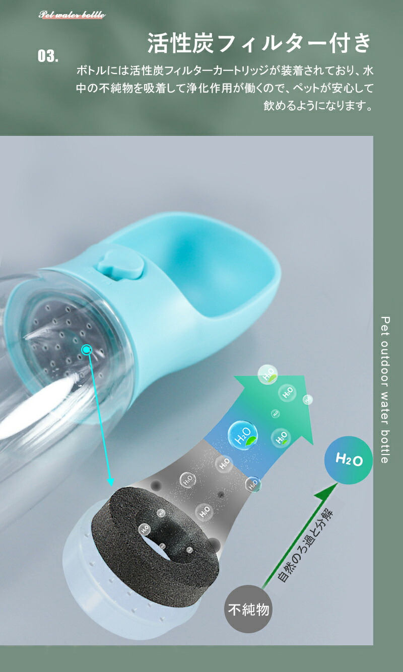 ・【活性炭フィルター付き】ボトルには活性炭フィルターカートリッジが装着されており、水中の不純物を吸着して浄化作用が働くので、ペットが安心して飲めるようになります。