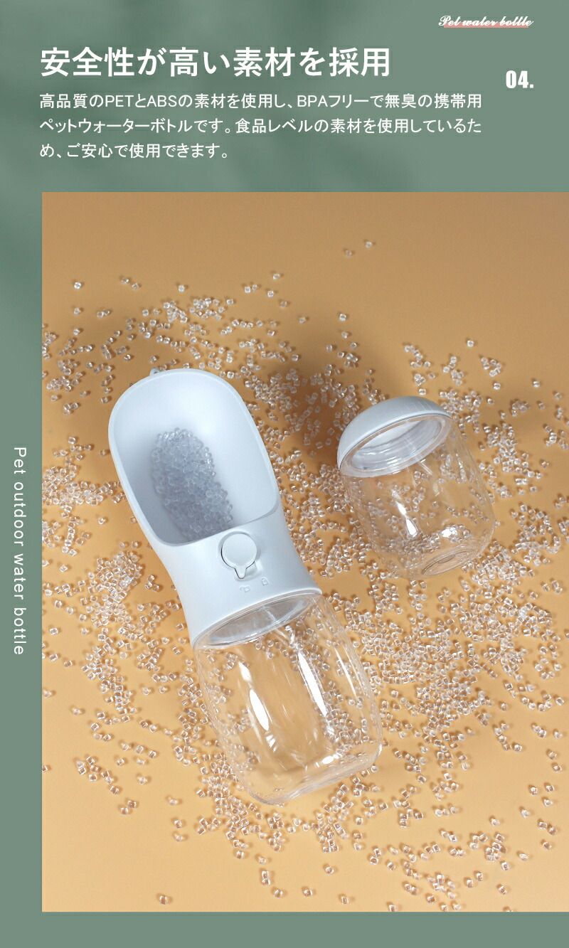 ・【安全性が高い素材を採用】高品質のPETとABSの素材を使用し、BPAフリーで無臭の携帯用ペットウォーターボトルです。食品レベルの素材を使用しているため、ご安心で使用できます。