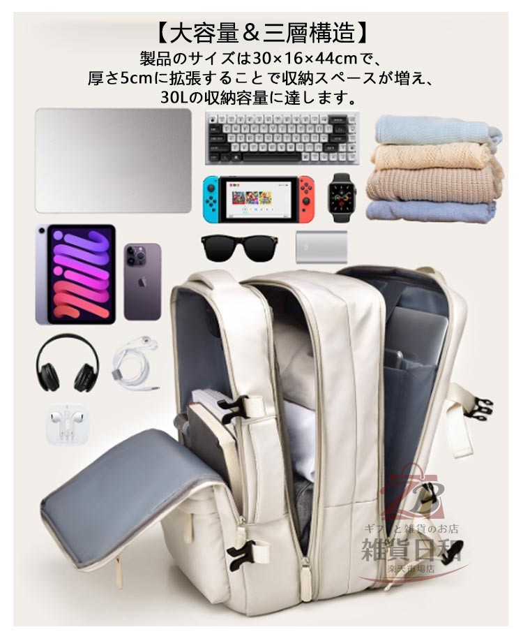 大容量三層構造、USB充電ポート付き、15.6インチPC収納可能、キャリーオン対応、180°開閉方式、乾湿分離ポケット、防水加工、軽量設計