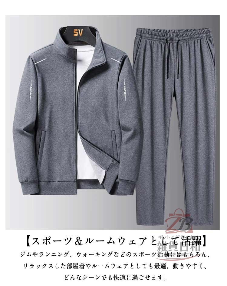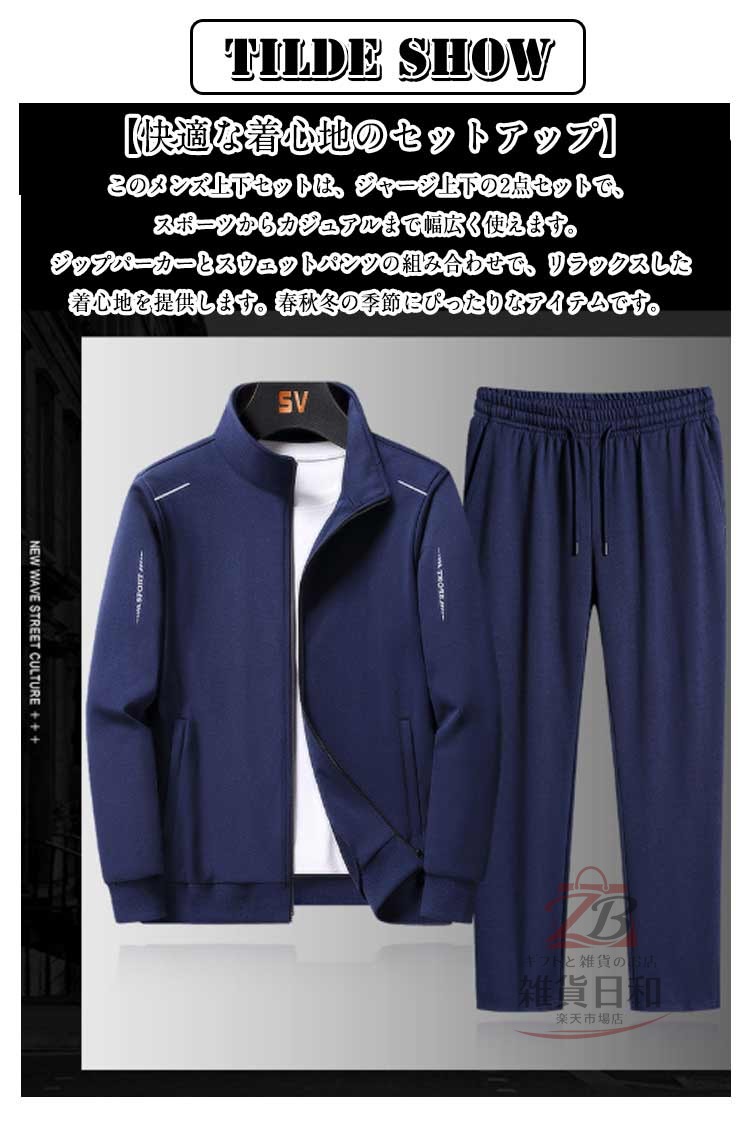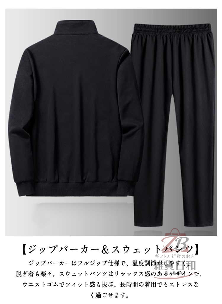 このメンズ上下セットは、ジャージ上下の2点セットで、スポーツからカジュアルまで幅広く使えます。ジップパーカーとスウェットパンツの組み合わせで、リラックスした着心地を提供します。春秋冬の季節にぴったりなアイテムです。