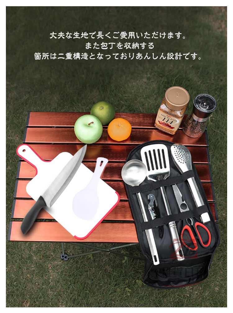 高機能アイテムを集めた充実のツールバッグ。調理器具の収納・持ち運びの悩みを解決する、それぞれ収納場所が決まった設計です。大きく開くので出し入れもスムーズ。丈夫な生地で長く愛用できます。包丁収納部は二重構造の安心設計。