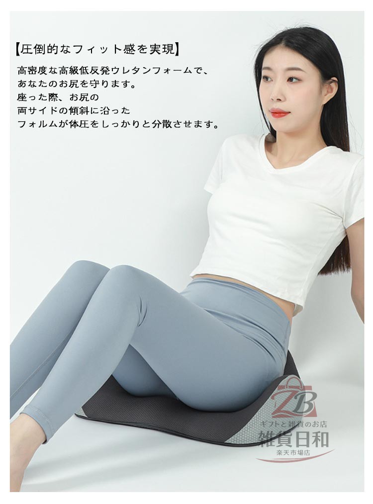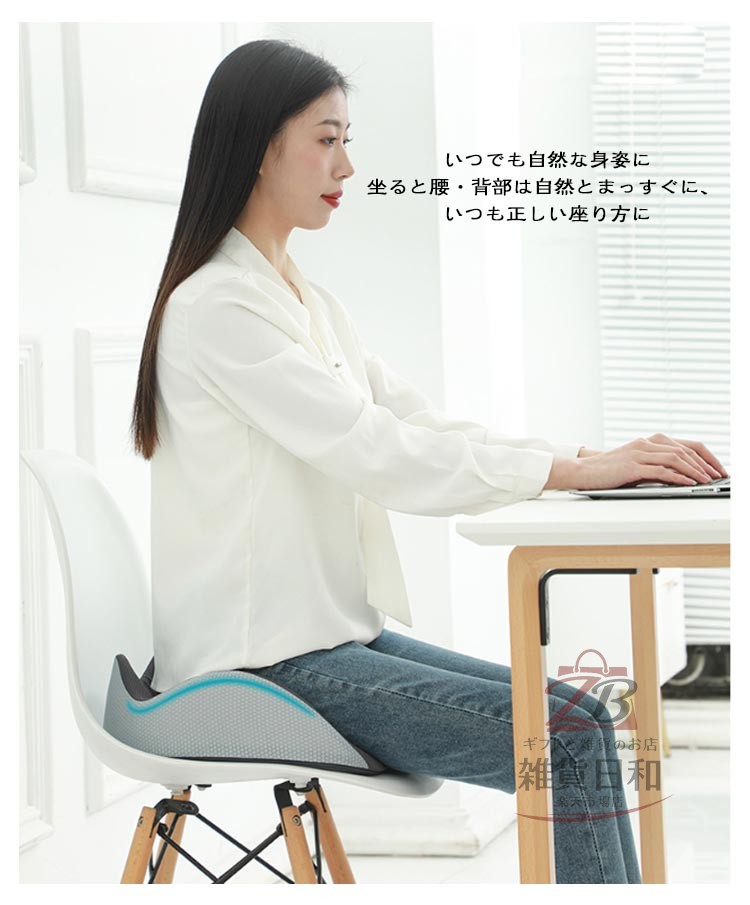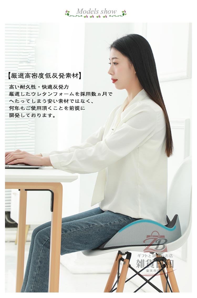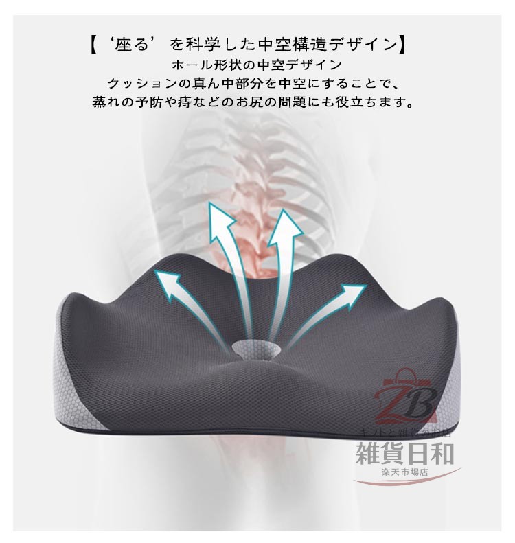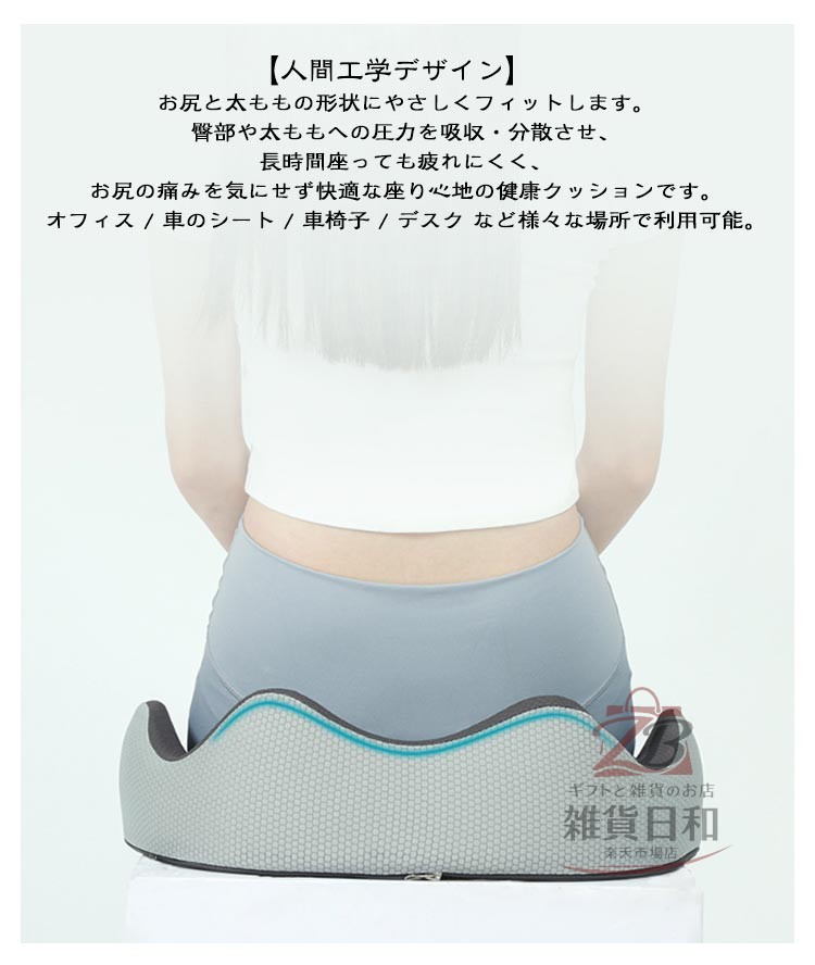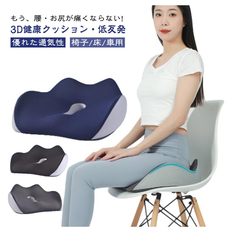 もう、腰・お尻が痛くならない! 3D健康クッション・低反発 優れた通気性 椅子/床/車用 いつでも自然な身姿に 坐ると腰・背部は自然とまっすぐに、 いつも正しい座り方に ・カバーが洗えて清潔に ・全体をしっかり支える ・お尻が蒸れないように ・大きく包み込む感じ 快適な座り心地を実現する 3Dフィットクッション5つのポイント ・独自の3Dフォルム ・高密度50Dウレタン ・中空構造 ・こだわりのカバー ・滑り止め付き しっかりとした座り心地を実現! 【厳選高密度低反発素材】 高い耐久性・快適反発力 厳選したウレタンフォームを採用数ヵ月でへたってしまう安い素材ではなく、 何年もご使用頂くことを前提に開発しております。 【圧倒的なフィット感を実現】 高密度な高級低反発ウレタンフォームで、あなたのお尻を守ります。 座った際、お尻の両サイドの傾斜に沿ったフォルムが体圧をしっかりと分散させます。 太腿の付け根部分も滑らかに凹ますことでフィット感が高まります。 【姿勢を美しくするフォルム】 3D形状の流線型のフォルムにより、骨盤のゆがみを改善する効果が期待できます。座るだけで自然に前傾する姿勢を保ち、背筋が自然と伸びることで無理なく正しい姿勢へ導きます。 【人間工学デザイン】 お尻と太ももの形状にやさしくフィットします。臀部や太ももへの圧力を吸収・分散させ、長時間座っても疲れにくく、お尻の痛みを気にせず快適な座り心地の健康クッションです。オフィス / 車のシート / 車椅子 / デスク など様々な場所で利用可能。 【‘座る’を科学した中空構造デザイン】 ホール形状の中空デザイン クッションの真ん中部分を中空にすることで、蒸れの予防や痔などのお尻の問題にも役立ちます。