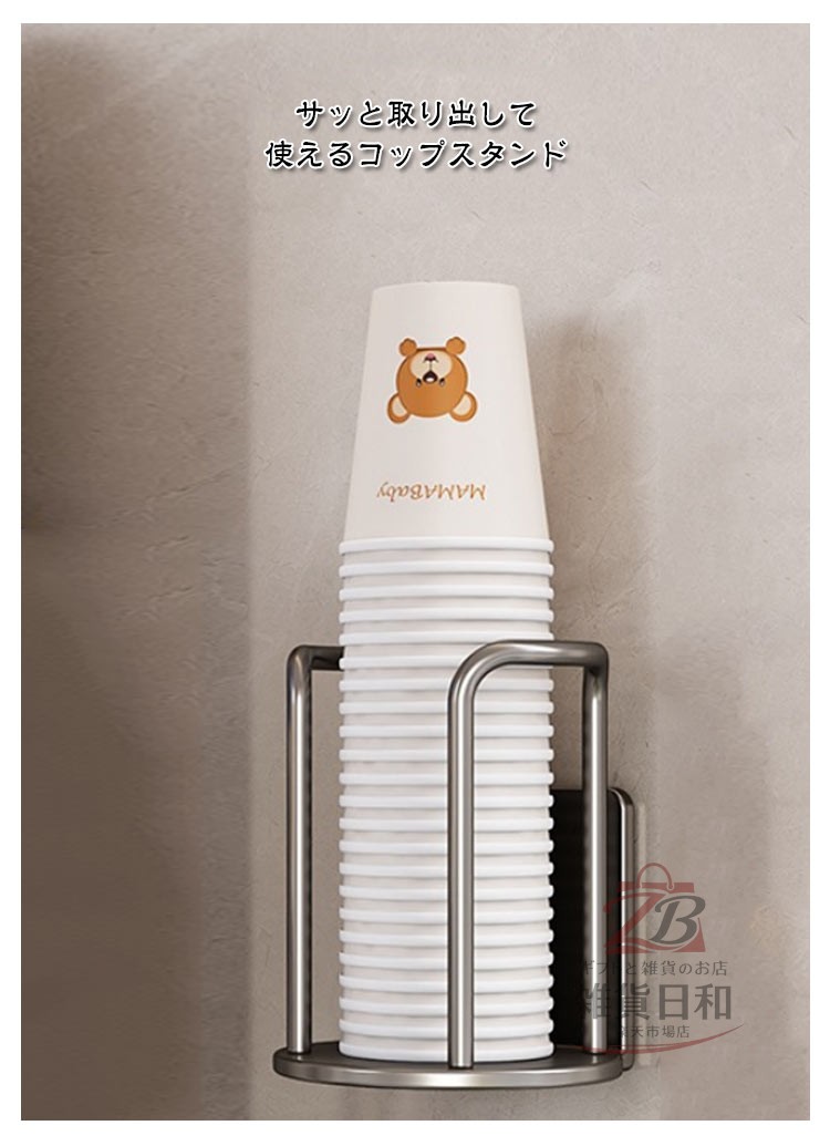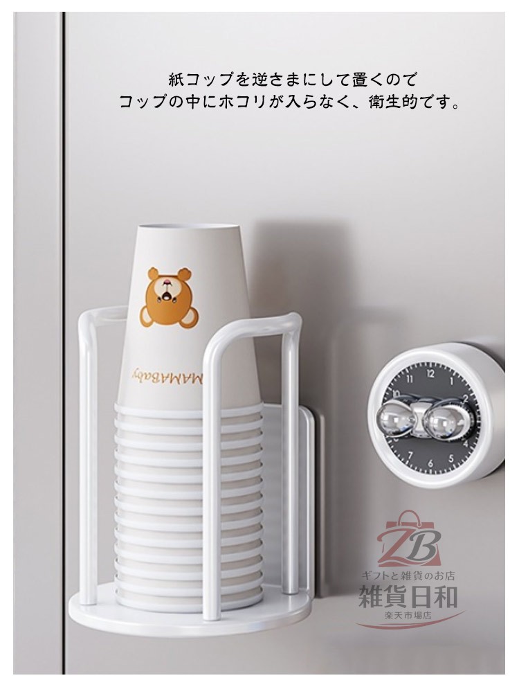 サッと取り出して使えるコップスタンドです。紙コップを逆さまにして置くのでコップの中にホコリが入らなく、衛生的です。