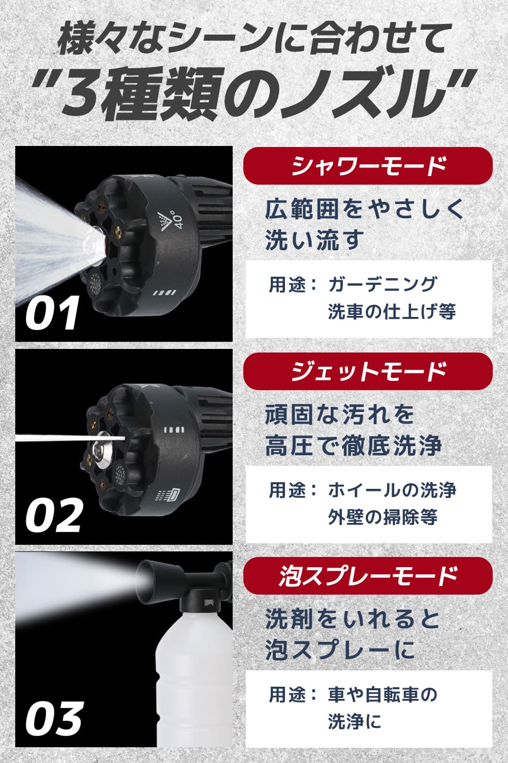 「泡スプレーモード」:洗剤を入れて泡洗浄が可能。
