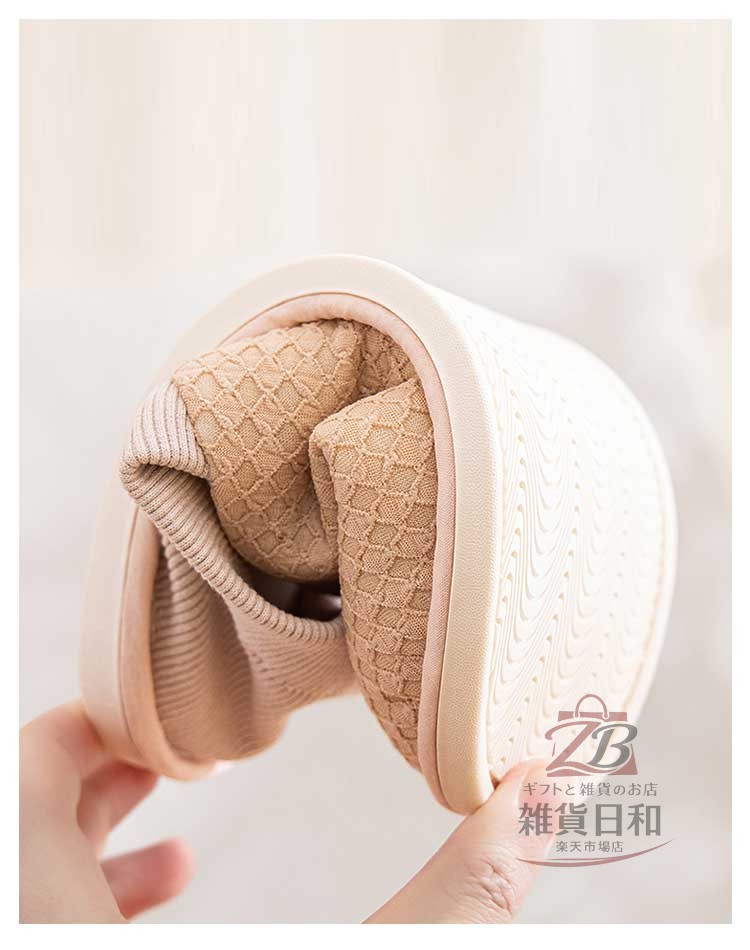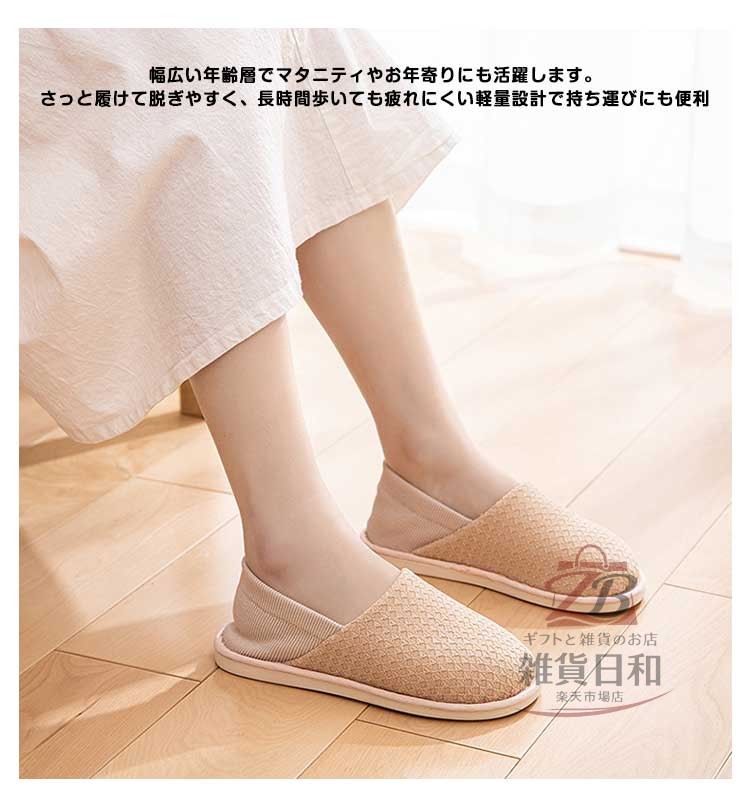 おしゃれでシンプルなデザインの室内履きルームシューズです。アッパー素材にはやわらかい素材を採用しているので、外反母趾の方でも楽に履けます。歩行時にフィットした状態で足に負担がかからず、快適に歩行ができます。とてもシンプルで、かかとあり・つま先ありの室内用スリッパ(滑り止め付き)。幅広い年齢層でマタニティやお年寄りにも活躍します。さっと履けて脱ぎやすく、長時間歩いても疲れにくい軽量設計で持ち運びにも便利。介護・リハビリや入院用のルームシューズ。妊娠中、産後の室内用。底面は滑り止め衝撃吸収ソールとなっています。