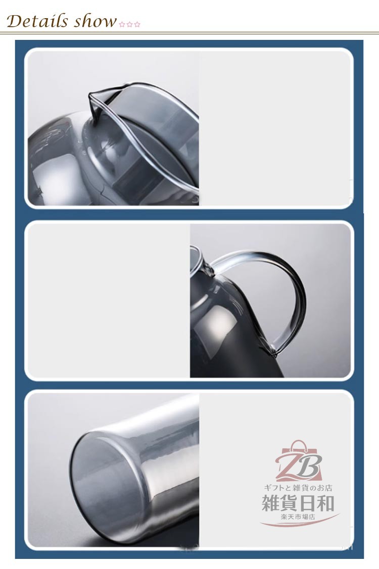 耐熱ガラス製で熱い飲み物にも冷たい飲み物にも使用可能。口径が大きく手が直接入るため洗浄が容易。夏は冷たいジュースや麦茶、冬は温かいお茶など通年使用可能。直火対応のホウケイ酸ガラスを使用。厚手ガラスで頑丈。デザイン性が高く高級感がある。IH調理器では使用不可。