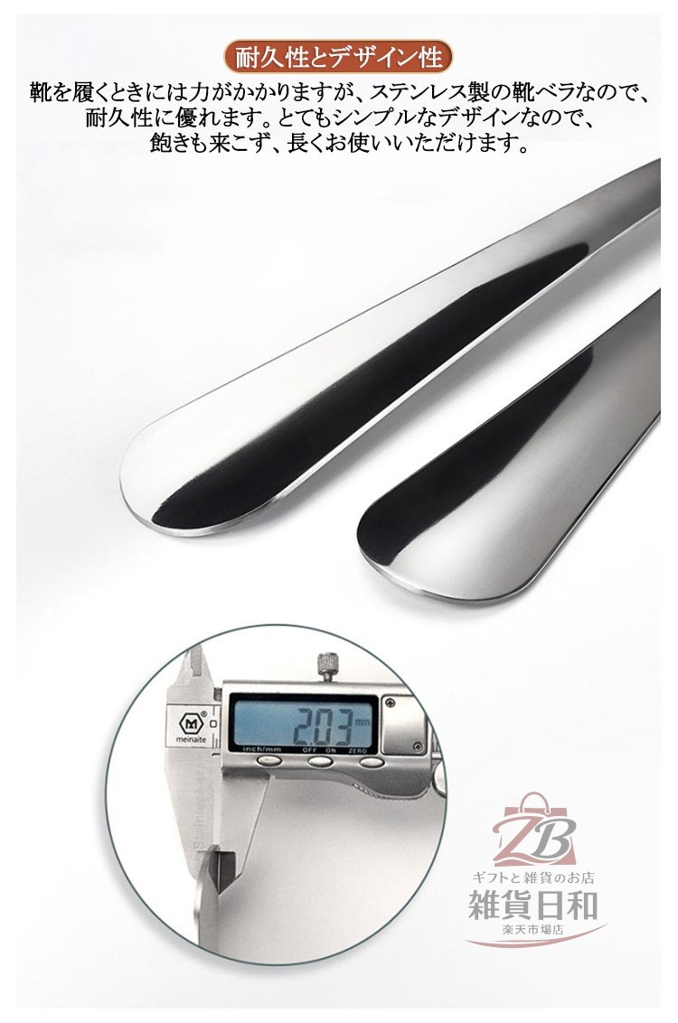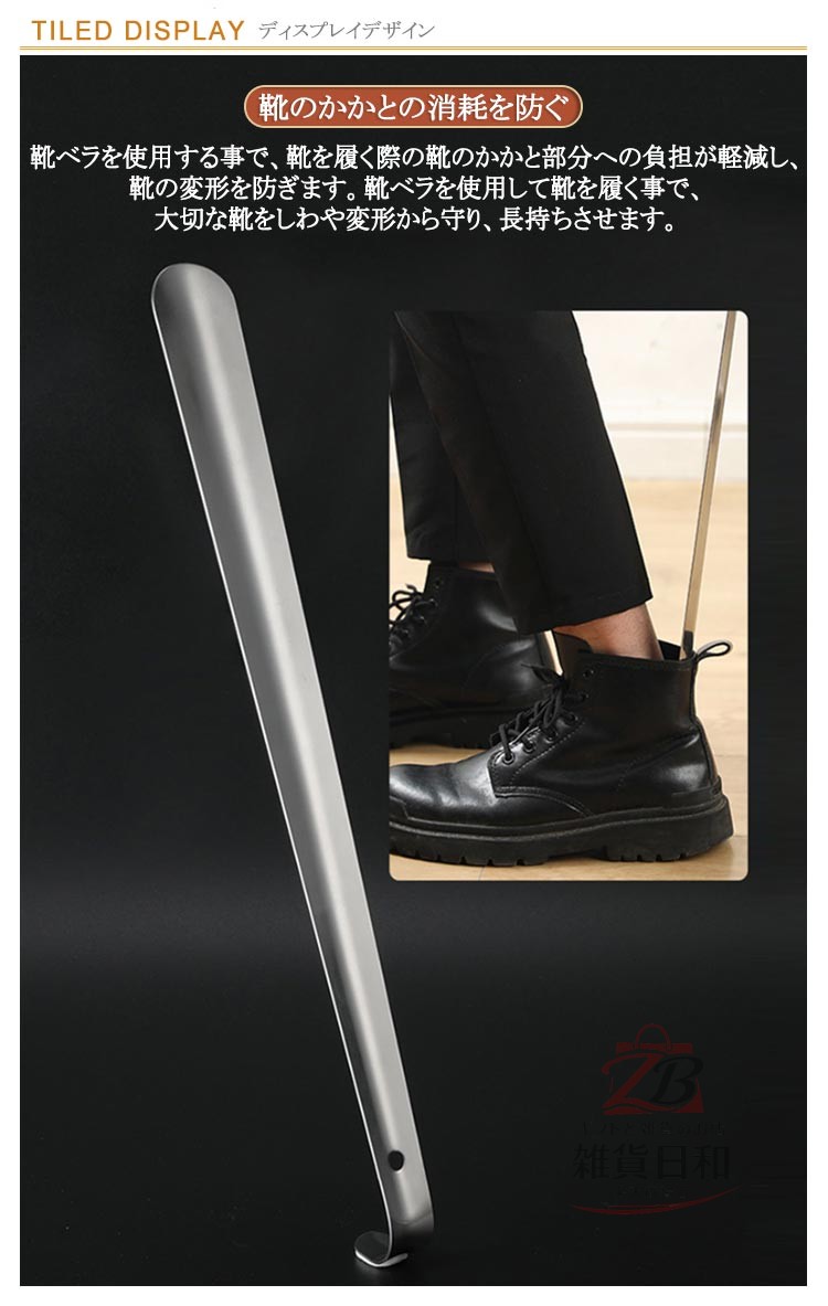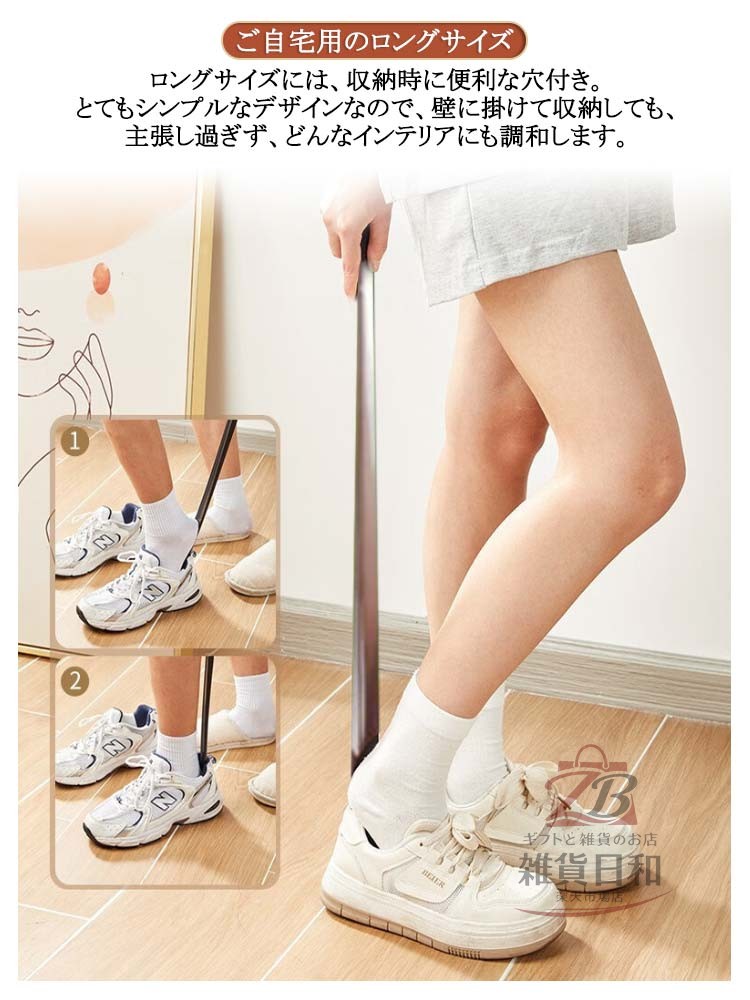 高級感のあるステンレス製ロング靴ベラ 長さ80cm 【靴のかかとの消耗を防ぐ】靴ベラを使用する事で、靴を履く際の靴のかかと部分への負担が軽減し、靴の変形を防ぎます。靴ベラを使用して靴を履く事で、大切な靴をしわや変形から守り、長持ちさせます。【耐久性とデザイン性】靴を履くときには力がかかりますが、ステンレス製の靴ベラなので、耐久性に優れます。とてもシンプルなデザインなので、飽きも来こず、長くお使いいただけます。【ご自宅用のロングサイズ】ロングサイズには、収納時に便利な穴付き。とてもシンプルなデザインなので、壁に掛けて収納しても、主張し過ぎず、どんなインテリアにも調和します。
