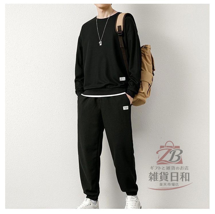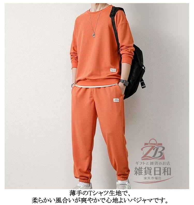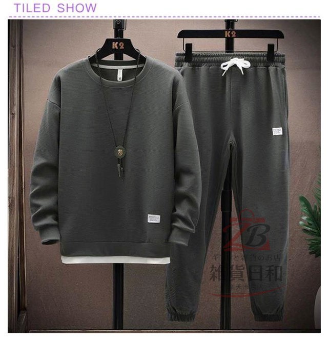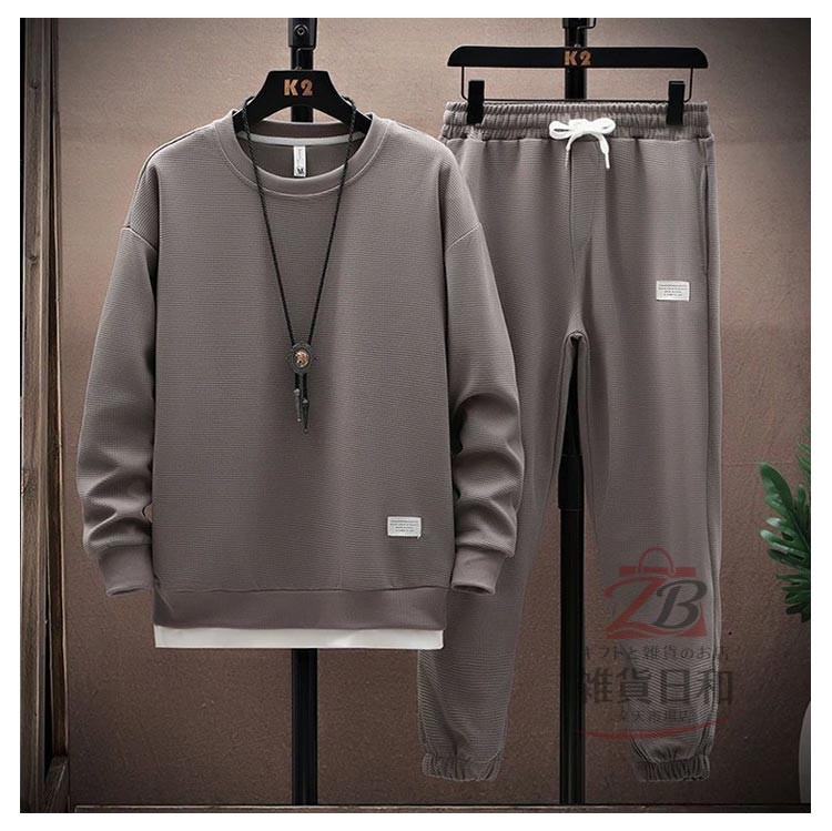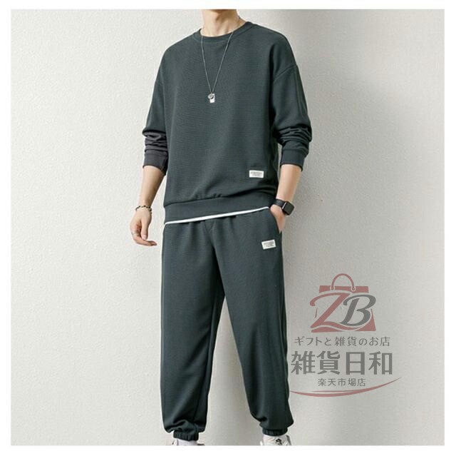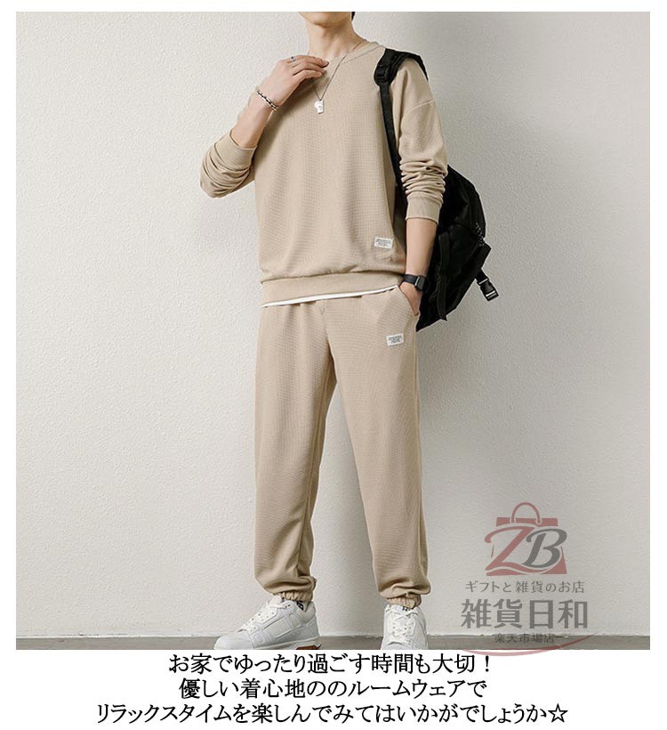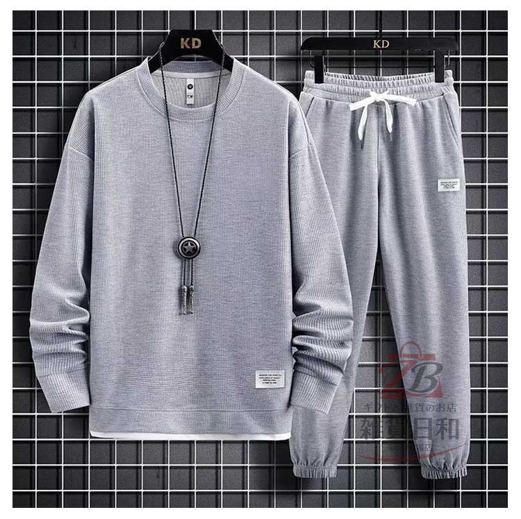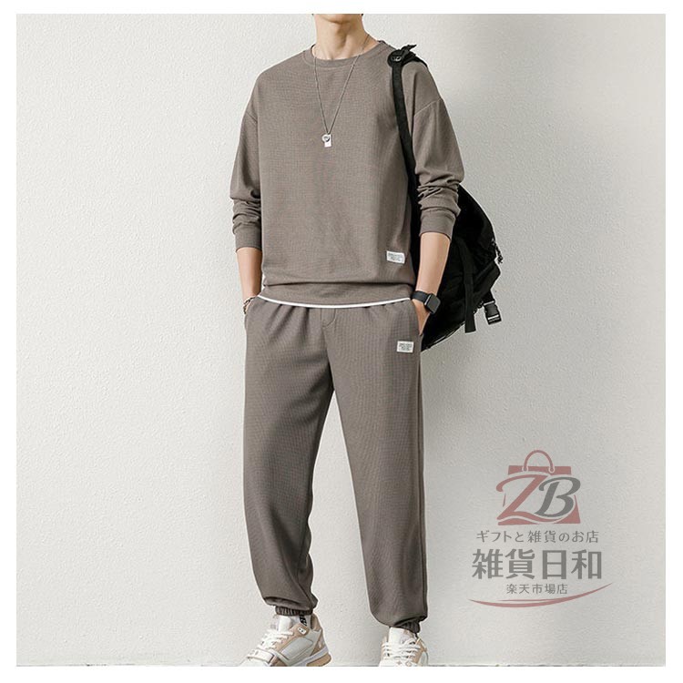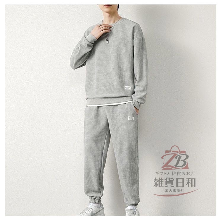 メンズ スウェット セットアップ ルームウェア 上下 無地 トレーナー スウェットパンツ リラックス 部屋着 ジョガーパンツ イージーパンツ 春秋 春 レイヤード風 ワッフル クルーネック 秋