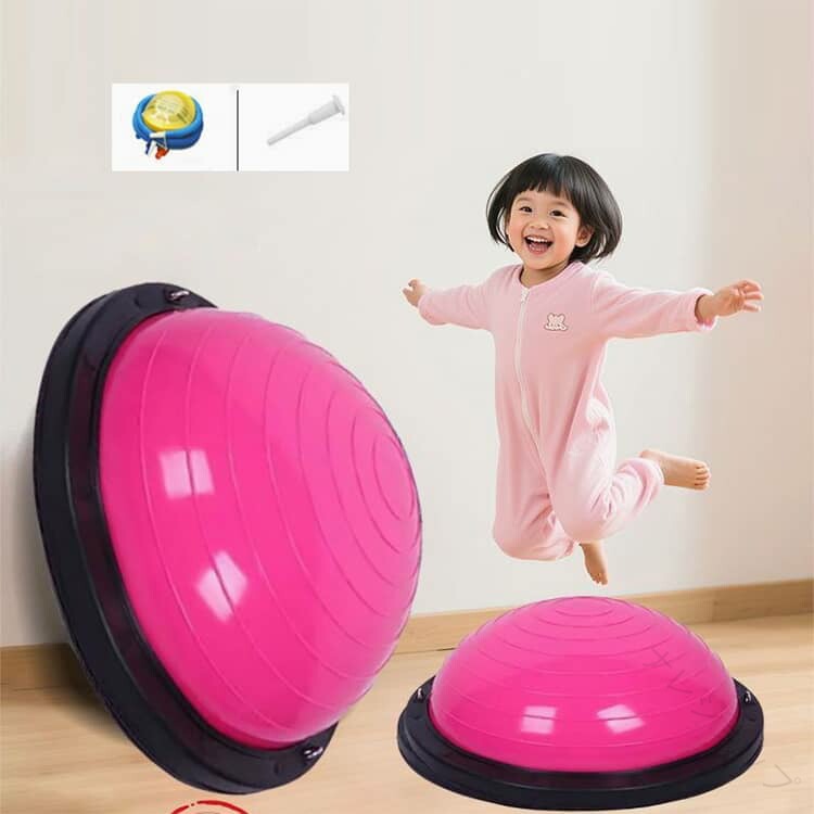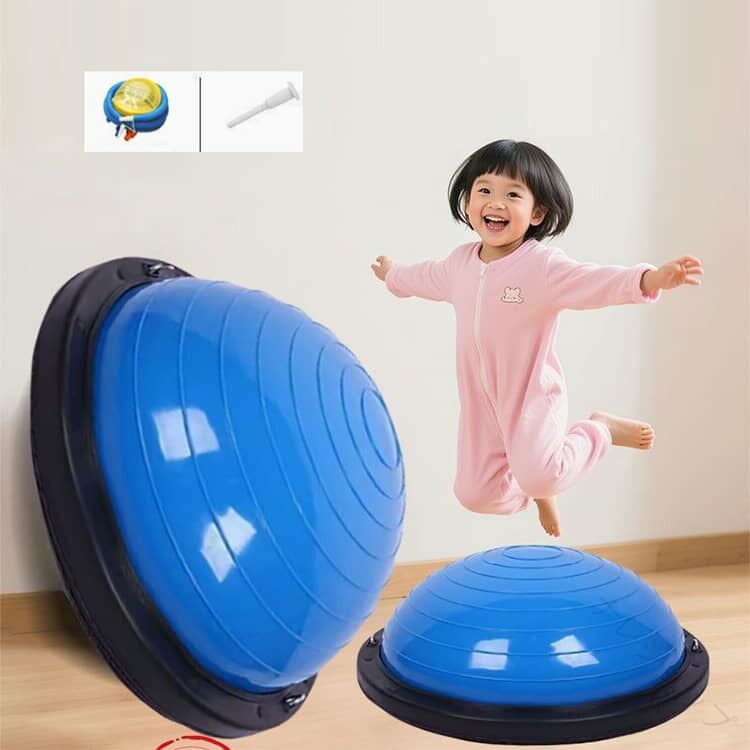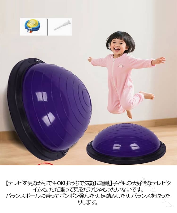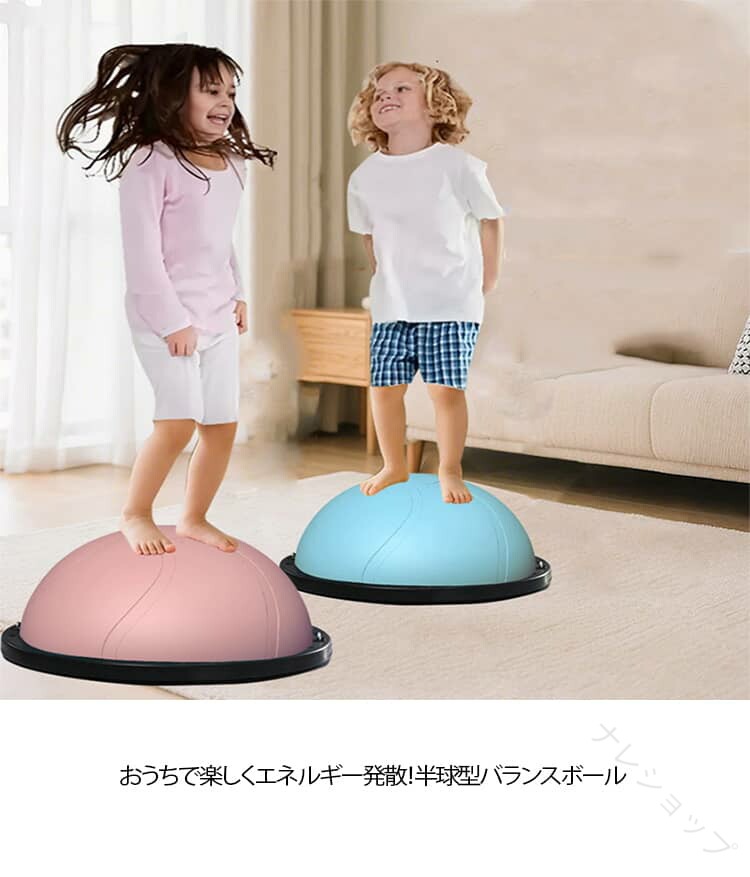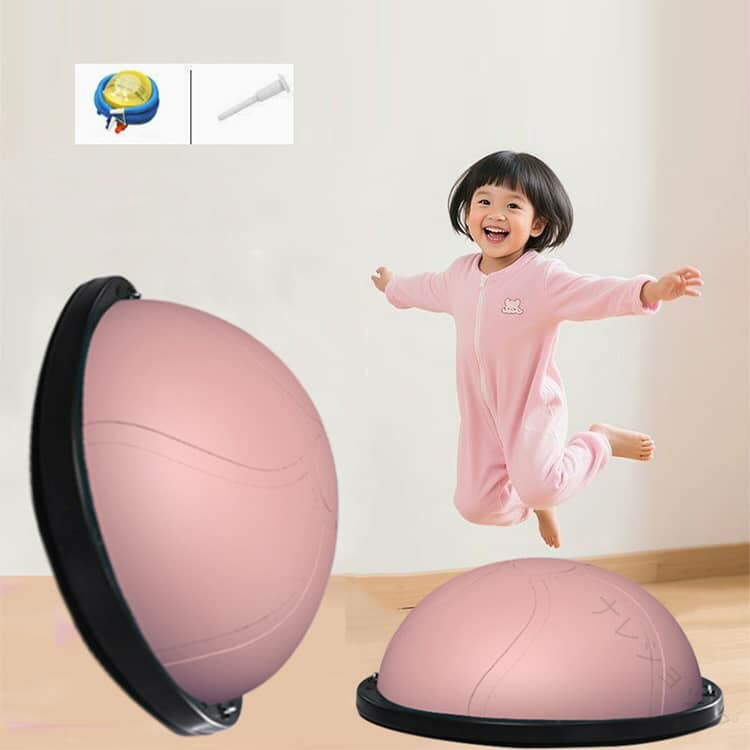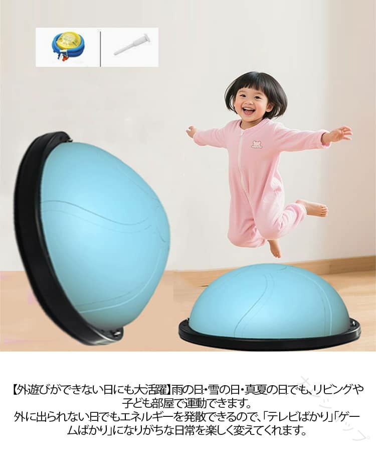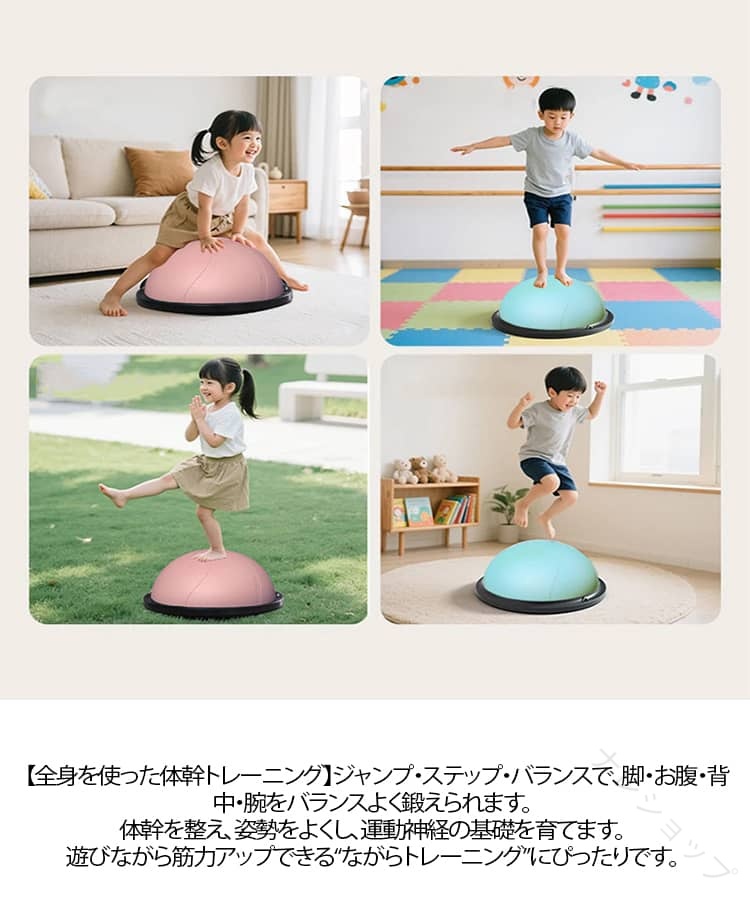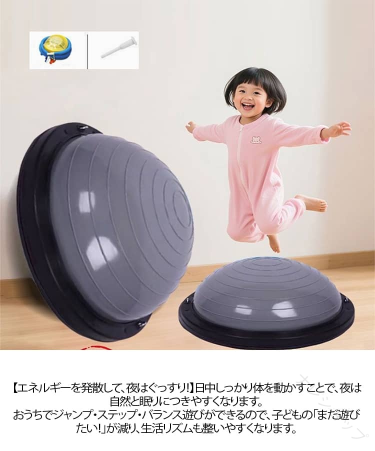 おうちで楽しくエネルギー発散!半球型バランスボール 【全身を使った体幹トレーニング】ジャンプ・ステップ・バランスで、脚・お腹・背中・腕をバランスよく鍛えられます。体幹を整え、姿勢をよくし、運動神経の基礎を育てます。遊びながら筋力アップできる“ながらトレーニング”にぴったりです。【外遊びができない日にも大活躍】雨の日・雪の日・真夏の日でも、リビングや子ども部屋で運動できます。外に出られない日でもエネルギーを発散できるので、「テレビばかり」「ゲームばかり」になりがちな日常を楽しく変えてくれます。軽くて持ち運びも簡単なので、庭や公園にも持ち出せてどこでもエクササイズ可能です。【エネルギーを発散して、夜はぐっすり!】日中しっかり体を動かすことで、夜は自然と眠りにつきやすくなります。おうちでジャンプ・ステップ・バランス遊びができるので、子どもの「まだ遊びたい!」が減り、生活リズムも整いやすくなります。親の寝かしつけストレスを軽減し、家族みんなが笑顔になれるお手伝いをします。【テレビを見ながらでもOK!おうちで気軽に運動】子どもの大好きなテレビタイムも、ただ座って見るだけじゃもったいないです。バランスボールに乗ってポンポン弾んだり、足踏みしたり、バランスを取ったりします。テレビを見ながら全身を動かせる“ながら運動”で、楽しみながら体を動かします。