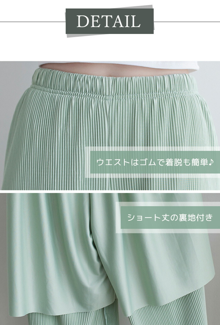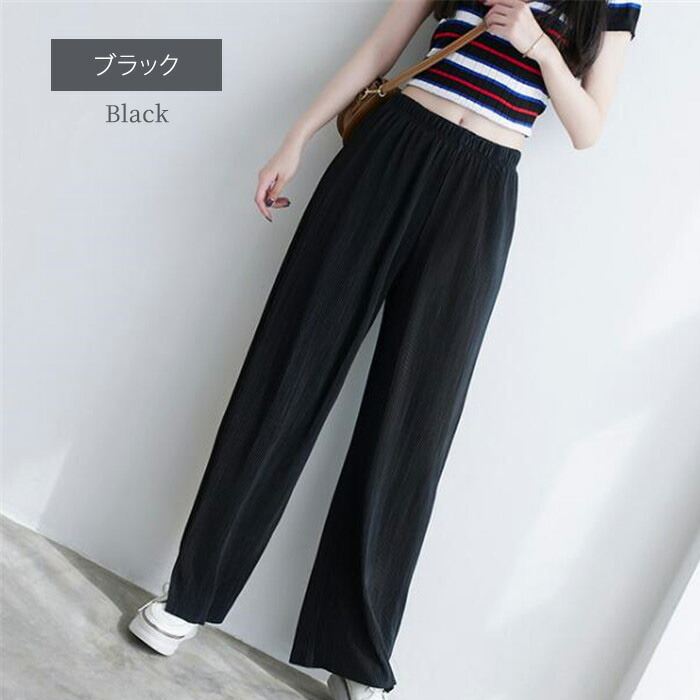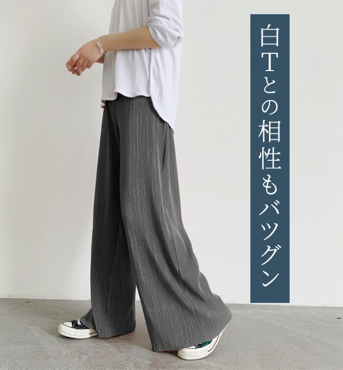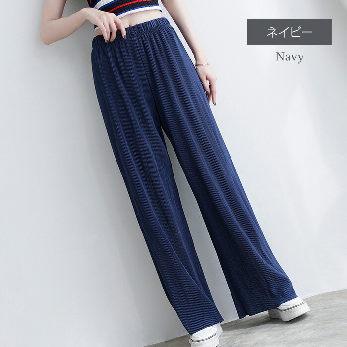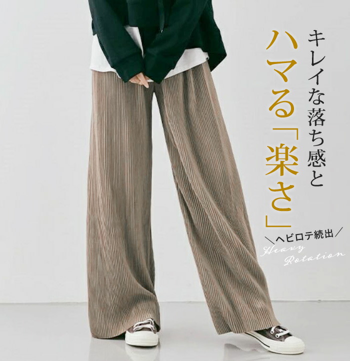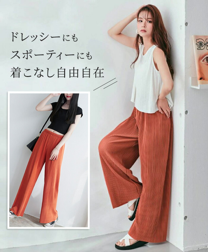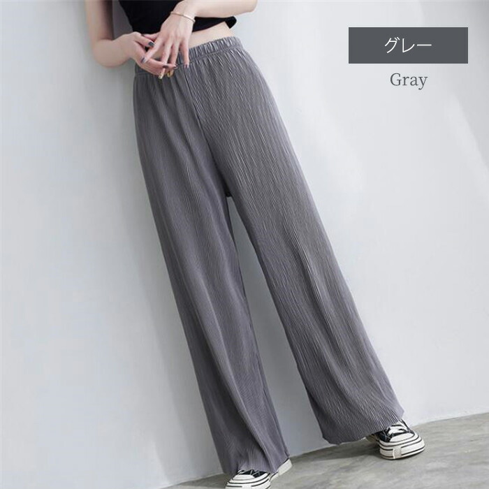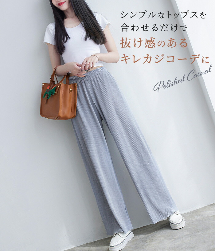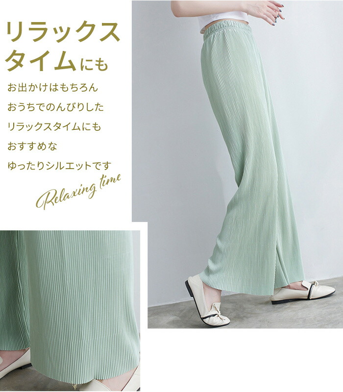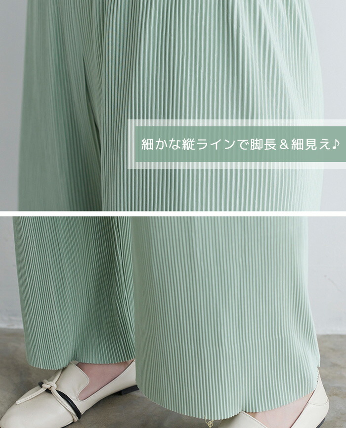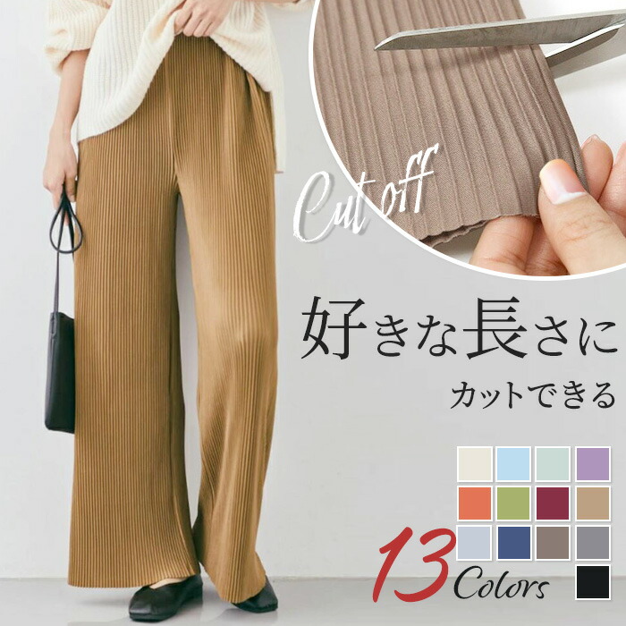 レディース パンツ ワイドパンツ プリーツパンツ セルフカット 切れる プリーツ 光沢感 縦ライン 高見え 高身長 低身長 イージーパンツ 裾カットOK ウエストゴム 体型カバー 春 夏 ボトムス